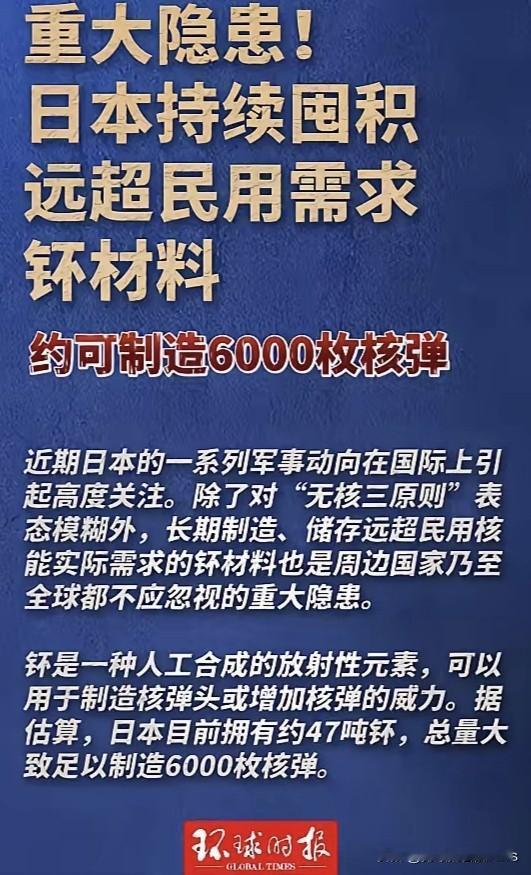 居心叵测!日本囤积钚材料约可制造6000枚核弹! 近段时间以来,日本在军事行动的动向一直都是国际社会所关注的重点。而钚是一种人工合成的放射性元素,是可以用于制造核弹头或者是增加核弹的威力。据悉,日本现在已经拥有约47吨钚,大约可以制造6000枚核弹。