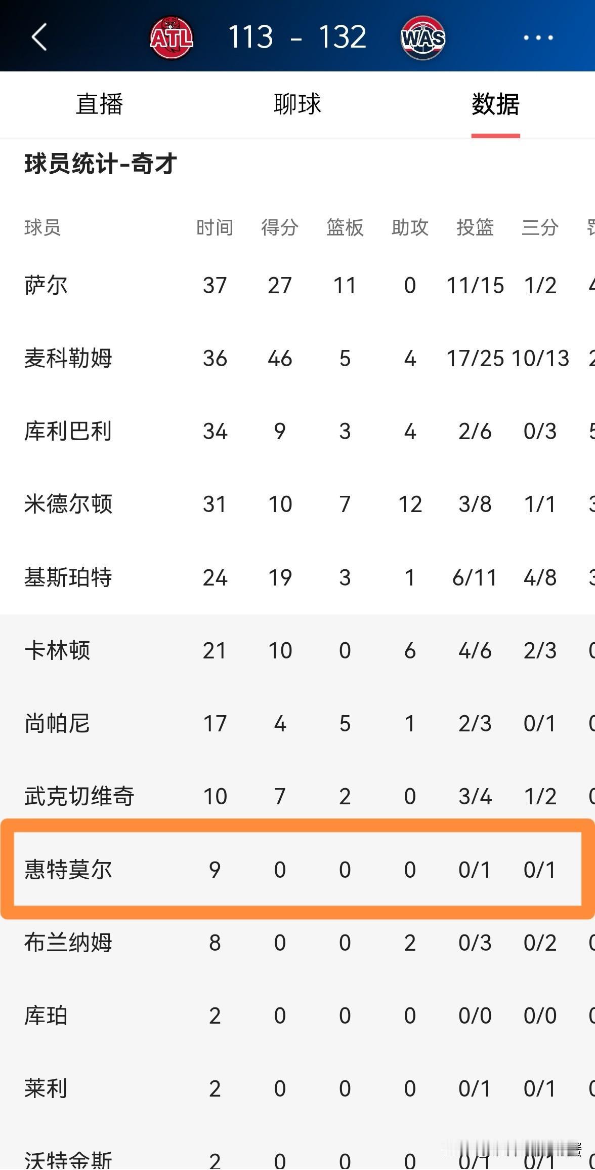 奇才大将惠特摩尔真是出工不出力!在今天奇才主场以132:113大胜老鹰的比赛中,惠特摩尔在替补出战的9分钟里连汗都没有出,他在攻防两端都毫无表现。 全场比赛下来,惠特摩尔替补出战9分钟,投篮1中0怒砍0分0篮板0助攻,不过有1次犯规。 在本场比赛中,惠特摩尔在进攻端蹲底角,在防守端散步,整体的表现让人感到非常失望。