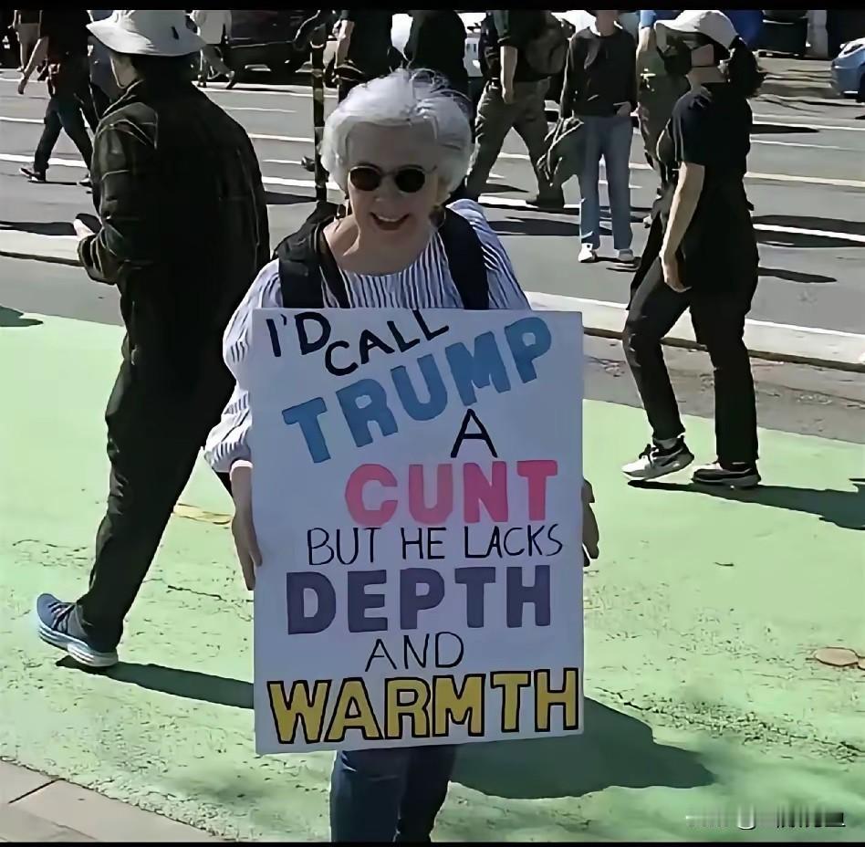 这老太也是幽默天才? 反对川普集会,牌子上写着:特朗普还不如我的下身,既没深度,也没温度。 这老太太简直是个段子手!七八十岁的人了,举着这么个牌子往人堆里一站,立马成了全场焦点。这话损得够高级,一句脏字不带,却把特朗普贬得一文不值。要比深度没深度,要比温度没温度,合着连老太太的私处都不如。 看看另一边特朗普支持者的标语,画风就糙多了。“你跟我锤子一样,又硬又犟”。这话虽然解气,但总感觉少了点味道。就像街坊吵架,声音是大,过脑就忘。老太太那句可不一样,像根小针,扎进去就拔不出来。 美国大选这出戏越来越有意思。两边支持者较劲,连骂人都分出档次了。知识分子喜欢玩隐喻,蓝领阶层爱来直接的。要论传播效果,还是老太太这种高级黑更胜一筹。照片在网上疯传,好多人边笑边点赞:这大妈年轻时肯定是个人物! 其实这种政治讽刺在美国有传统。从马克·吐温那会儿,美国人就爱用幽默怼政客。特朗普这些年没少被开涮,半夜脱口秀里天天拿他找乐子。可老太太这招更绝,把私密话题搬到大庭广众,还说得这么理直气壮。 要说特朗普也真行,能让人恨得这么有创意。老太太这把年纪不在家养老,非要顶着太阳举牌抗议,得是多大的怨气。这话里藏着两层意思:既骂特朗普肤浅没内涵,又讽他冷血没人情味。十几个单词把主要槽点全打包了。 现在这标语都成文化现象了。有人做成T恤,有人印成贴纸,估计过两天周边产品都要上市。比起那些喊打喊杀的口号,这种带着智慧的幽默反而更有杀伤力。特朗普自己就是个嘴炮王者,没想到被老太太用他最擅长的方式将了一军。 政治斗争搞成这样,倒像在看相声专场。你说美国民主乱套吧,可这种民间智慧还真让人服气。要搁某些国家,早被请去喝茶了。人家就能举着牌子满街走,还能被当英雄追捧。 其实老百姓心里都明白,骂得再花哨也改变不了现实。可这么一闹腾,至少让沉重政治多了点乐子。下次大选要是多几个这样幽默高手,投票率说不定都能往上窜一截。 各位读者你们怎么看?欢迎在评论区讨论。人到中年,什么是最重要 聊特朗普 特朗普雷人言论 川普特朗普 特朗普争议发言