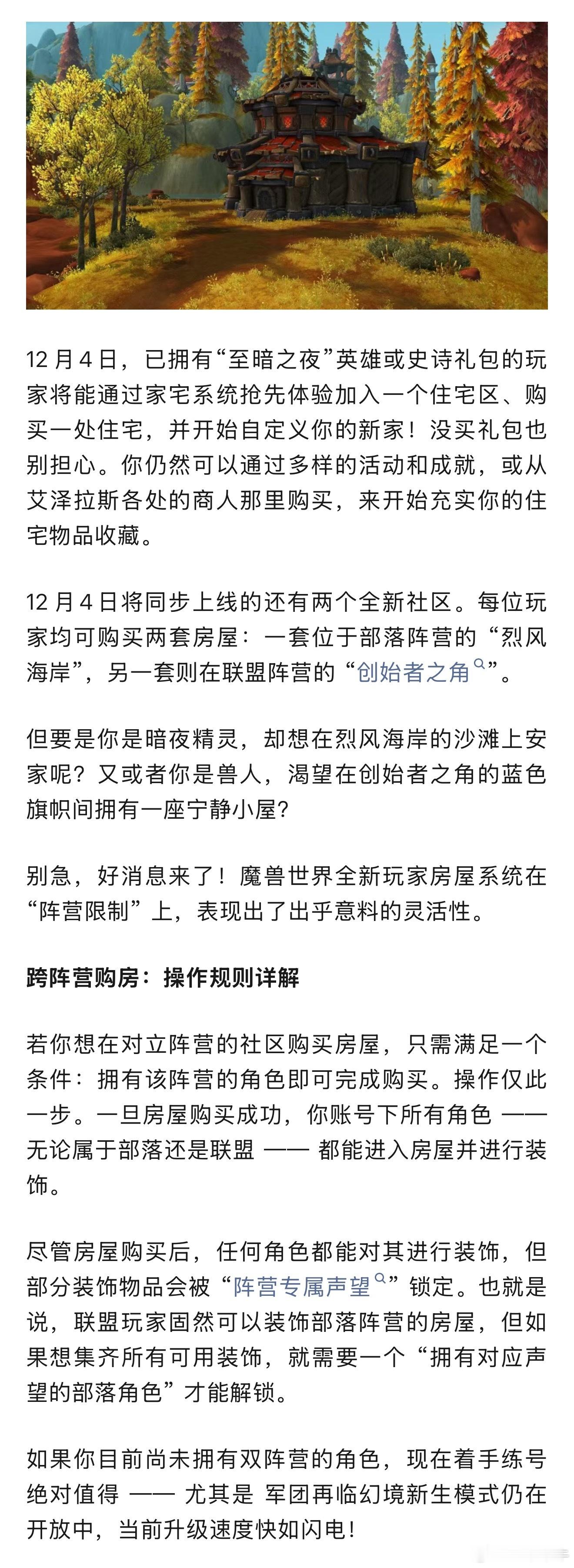 你是暗夜精灵,却想在烈风海岸的沙滩上安家呢?又或者你是兽人,渴望在创始者之角的蓝色旗帜间拥有一座宁静小屋?12月4日可跨阵营买房!但有一点点限制!魔兽世界魔兽世界