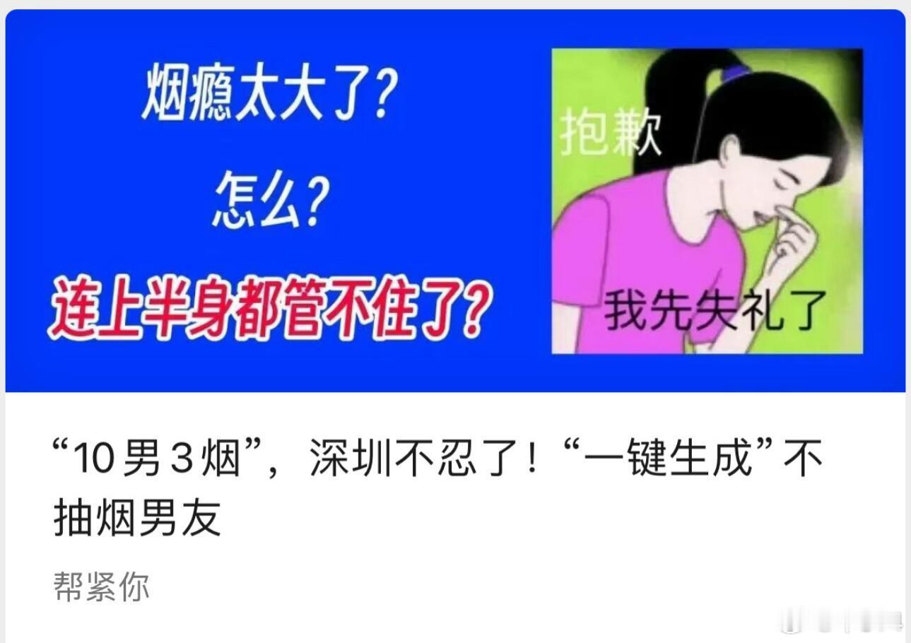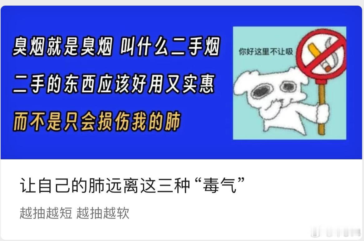 给深圳卫健委点个赞,禁言宣传这一块,你们是真的犀利又在行。个人是坚决支持室内场所禁烟的,哪怕短时间内做不到真的落实,也要加大监管处罚力度,尤其是那些在饭店非吸烟区里吸烟的、在电梯里吸烟的,抓到就是重罚,而且不是罚个50块100块就完事的,要按照收入比例处罚,参考欧洲一些国家的罚款力度,给他罚痛了才可以。抽烟这块深圳卫健委越骂越勇禁烟深圳卫健委发文怒怼二手烟