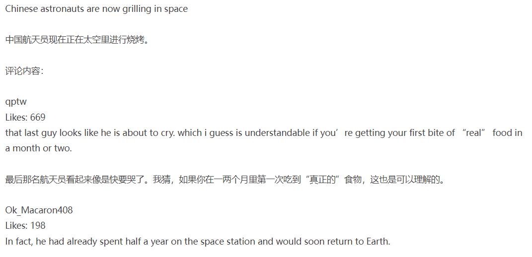 外网提问:“中国人在太空吃烧烤,到底刺激了谁?”[害羞][灵光一闪][呲牙][可爱] 万万没想到一件“烧烤小事”居然又让老外们破防了! 近日,中国宇航员们在太空吃现烤鸡翅、现烤牛排让外国网民气的不行! 外国网民留言称:“他们竟然在太空中可以如同在地面上一样烹饪食物,难道国际空间站已经落后中国到了如此地步?!” 有外国网民酸酸的发文:“难道美国人在空间站只配吃军用干粮?看看吧!中国宇航员现在已经能吃上烤肉了!” “不必羡慕!太空烧烤并不能带来科研成果!” 不过在众多留言中,印度网民的留言更富有趣味性,他说:“仔细看最后的那名中国航天员,他看起来像是快要哭了。我猜,如果一个人在一两个月里第一次吃到“真正的”食物,这表情也是可以理解的!” 鉴于此,笔者借用国外一位比较务实的网民的一则留言回复他: “要是中国人把吃剩的鸡骨头往国际空间站里一扔,那帮人会像狗一样跟着骨头跑!” 哈哈哈![可爱][呲牙][灵光一闪][害羞]中国太空探索对世界有什么影响?中国空间站和国际空间站的区别在哪
