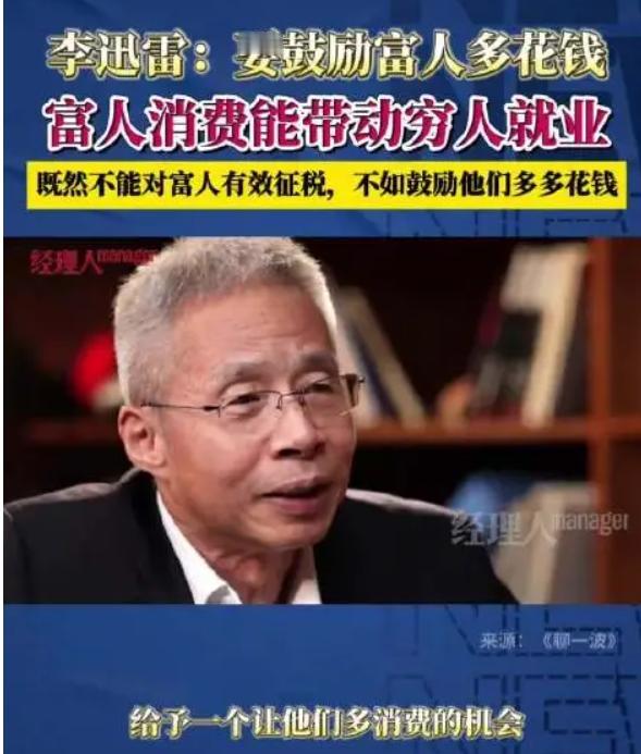 专家建议:要鼓励富人多多花钱![鼾睡][可爱][酷拽] 近日,网上有位自称是著名经济学家的李某雷教授在接受采访时,表达了这样一种观点: “既然不能对富人有效征税,还不如鼓励他们多多花钱!这样就可以带动穷人就业!” 这位著名经济学家的观点让人觉得奇葩异常,但且耐人寻味! 早在去年四月份,他就提出:“如果不能对富人进行有效征税,至少应该对富人进行有效的消费刺激,进一步增加消费,扩大就业”。这是在国家提出大力提振消费的大环境之下,这位专家给出的最有“价值”的建议! 笔者仔细一想,似乎还真是这个理! 因为富人一般不缺资金而是缺项目,穷人是既缺资金又缺机会!似乎从富人手指缝里流出一点财富,对于普通人而言有可能就是他的“一辈子”! 所以刺激富人先动起来消费,让项目和资金运转起来,这似乎才是上策。 因为资金有了流动,才会有机会让一小部分财富通过富人的手指缝隙流向穷人!而不是现在吆喝着让底层人民拿出那多少年积攒的三瓜两枣来填各种社会窟窿![害羞][酷拽][可爱][鼾睡]