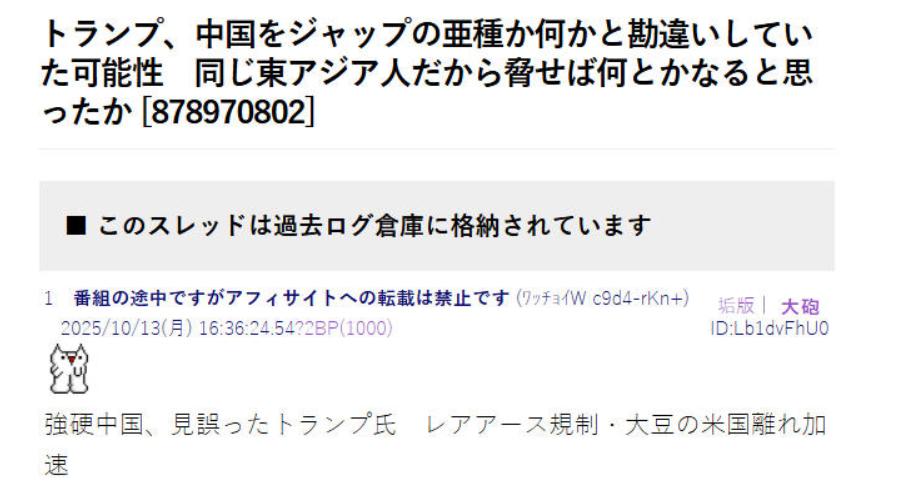 严重误判!日网友提醒川普:“中国和日本可不一样!”[灵光一闪][捂脸][惊呆] 近日,外网对于中国硬刚美国关税已经吵得热火朝天! 特别是一些跟随美国的亚洲国家,现在的感受如同苍蝇在喉,难受至极。 这些天,外网某论坛有日本网民提出这样的议题: “个人觉得特朗普是不是误以为中国和日本差不多,都是东亚人,所以觉得吓唬一下就能解决问题?” 日本某媒体干脆以《强硬的中国,判断失误的特朗普,稀土管制和大豆正在使“去美国化”加速!》为题,提出这样的论点: 现在的中国着眼于与美国的长期对立,他们有实力始终保持强硬姿态! 中国不仅对稀土实施出口管制,还在美国大豆进入收获季时,扩大了“绕开美国”的采购网络,中国毫不妥协的应对措施,让特朗普总统严重误判! 反正不管怎样,日本网民已然晓得:“全球力量的重心正在往亚洲偏移,美国到现在还没有意识到他们用对待日韩的态度用来对待中国时根本行不通!” “中国不是吓大的!” 有日本网民总结性的发言称:“忠犬"般的日本、“舔狗”样的韩国与"野狼”似的中国相比就是不一样!完全不一样!!希望特朗普总统明白这一点!![捂脸][鼾睡][灵光一闪][呲牙]如何看中美关系中方驳斥“美财长指责我谈判代表”美称印度承诺将停买俄石油 俄方回应
