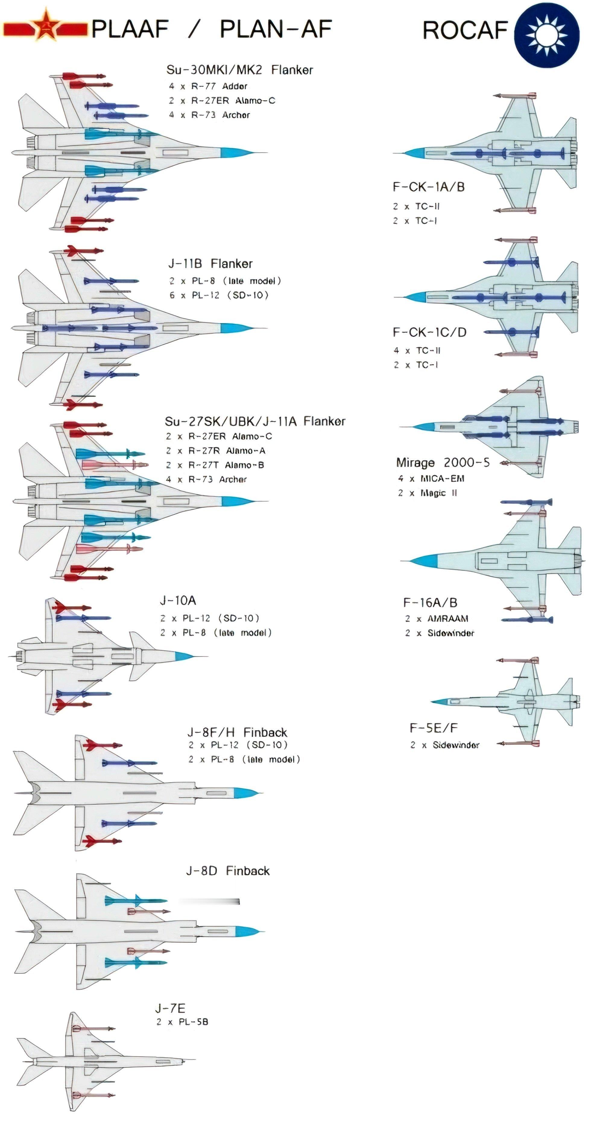 飞扬军事 一张很有意思的信息图表,对比了几年前中国人民解放军空军与中国台湾地区空军主力战机的空优挂载配置。若这张图表放在如今制作,解放军的歼-10、歼-11和歼-16战机将搭载超远程的PL-15空空导弹,而台空军的F-16战机则会以升级后的F-16V标准呈现——台湾海峡上空的空中力量平衡正持续发生变化。