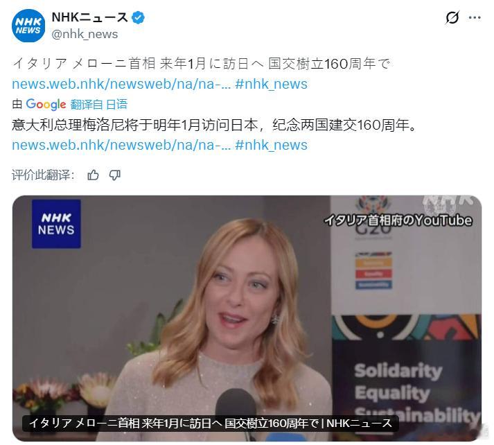 日媒:意大利总理梅洛尼将于明年1月访问日本,纪念两国建交160周年。两国建交始于1866年,二战后1952年恢复外交关系。意大利学者多尔西,批评日本近期“集体自卫权”讨论可能挑战和平宪法,呼吁国际社会警惕军国主义倾向。 警惕日本或成为亚洲最危险国家黄媒不会说的真相