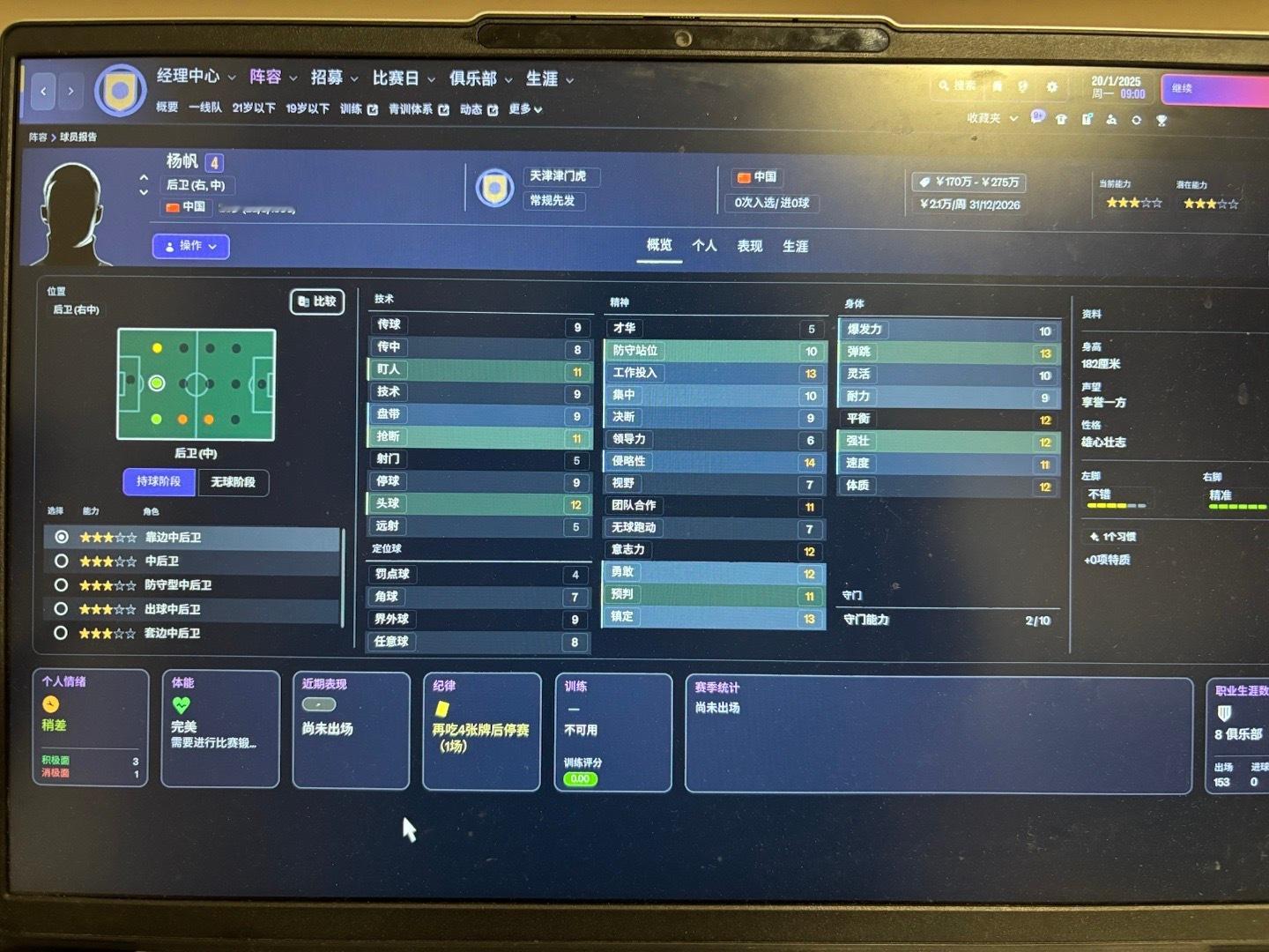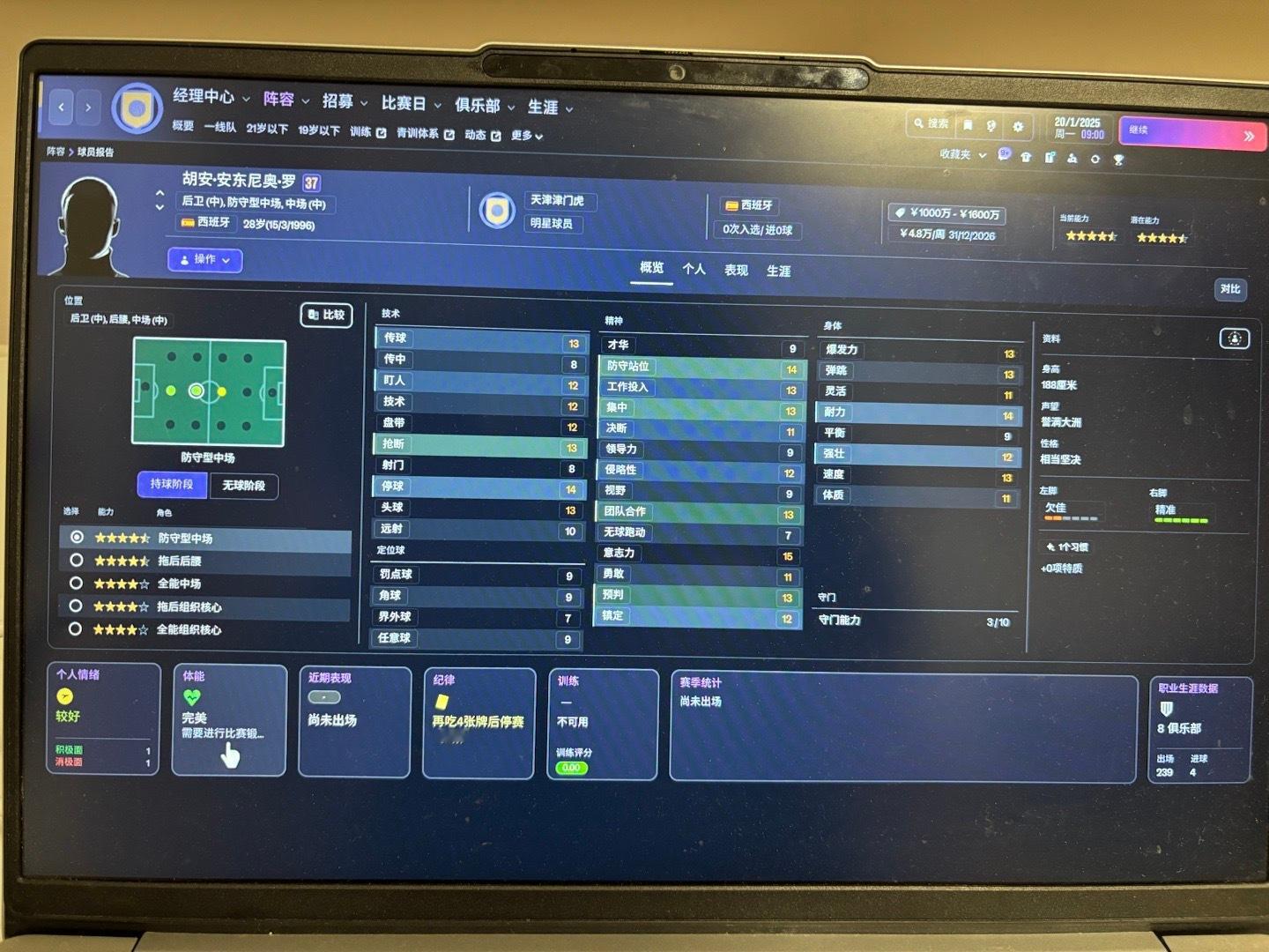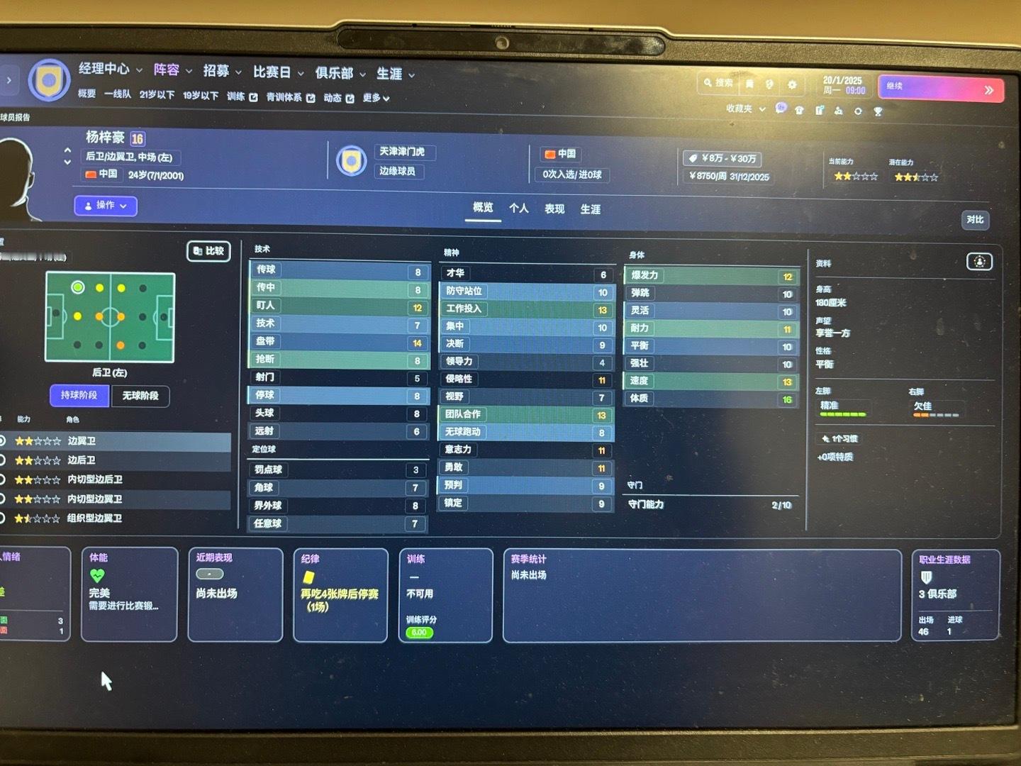 FM2026开档中超联赛 的天津津门虎 1️⃣以下主要是天津队主力➕主要轮换球员数据2️⃣整体来看,主力与替补的ca pa能力都相差较大,结合实战,津门虎主力的确是中上游水平,但替补勉强中甲中下游水平。3️⃣大家可以关注基莱斯、萨尔瓦多、哈达斯、罗斯和阿代米的数据。整体水平在中超中游位置。4️⃣结合实战,阿代米数据虽然不亮眼,但作为球队唯一爆点,还是相当关键。缺点易受伤。5️⃣基莱斯射术打到15,虽然对抗能力一般,但跑位鬼魅,创造机会能力不错。6️⃣王秋明、巴顿、杨帆、郭皓是队中数值最高的本土球员,实战能力也不错,他们在任何中超中游和下游球队,都有主力的水平和表现。7️⃣哈达斯是大腿球员,萨尔瓦多和罗斯更加体系化。但整体实战表现还不错。8️⃣谢维军、黄嘉辉、王献钧、孙铭谦均有主力轮换球员的价值,杨梓豪数值不错,但实战确实保守。9️⃣李嗣镕的数据,如果不引进主力右后卫,他可以竞争主力,而且实战效果不错。中超联赛 以上是天津津门虎足球经理26版本主力框架球员介绍。