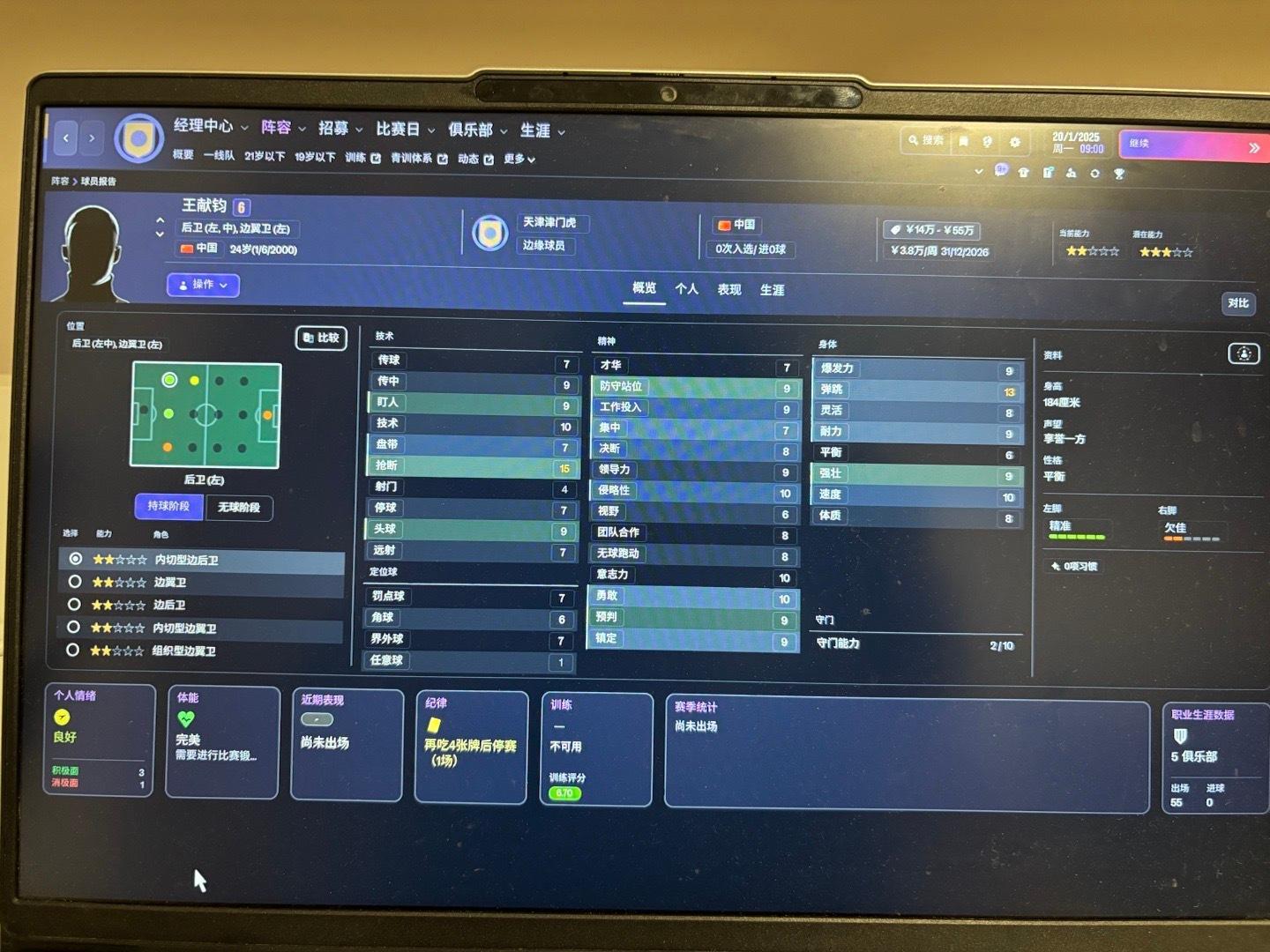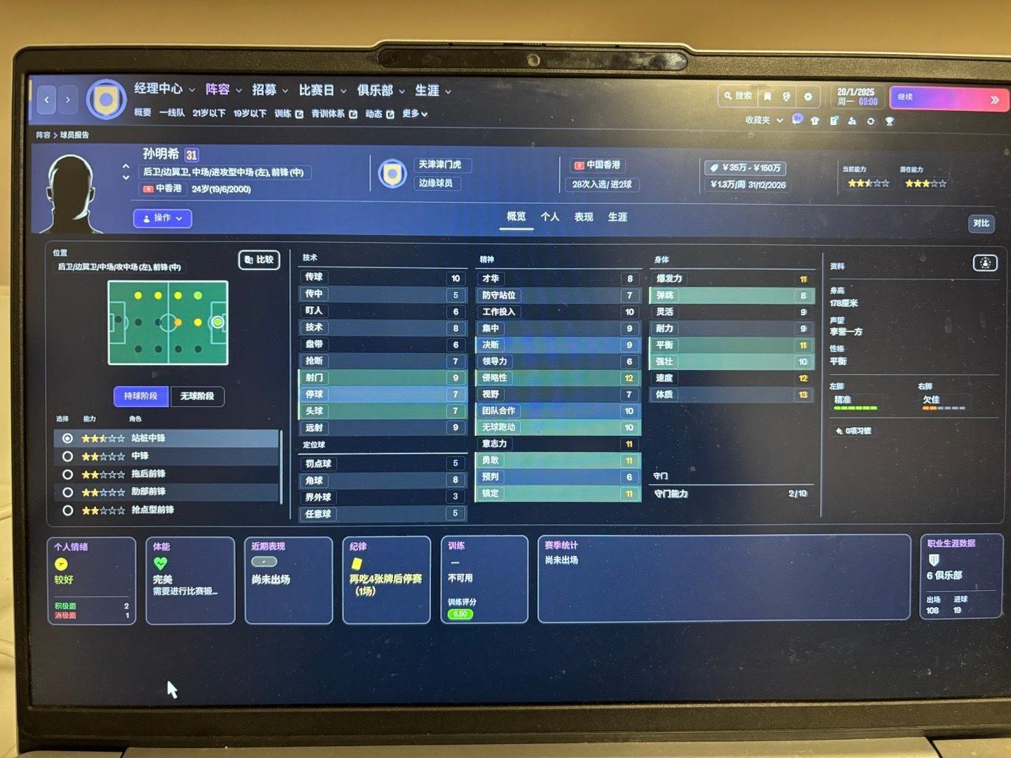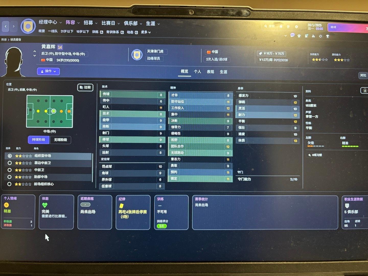 FM2026开档中超联赛 的天津津门虎 1️⃣以下主要是天津队主力➕主要轮换球员数据2️⃣整体来看,主力与替补的ca pa能力都相差较大,结合实战,津门虎主力的确是中上游水平,但替补勉强中甲中下游水平。3️⃣大家可以关注基莱斯、萨尔瓦多、哈达斯、罗斯和阿代米的数据。整体水平在中超中游位置。4️⃣结合实战,阿代米数据虽然不亮眼,但作为球队唯一爆点,还是相当关键。缺点易受伤。5️⃣基莱斯射术打到15,虽然对抗能力一般,但跑位鬼魅,创造机会能力不错。6️⃣王秋明、巴顿、杨帆、郭皓是队中数值最高的本土球员,实战能力也不错,他们在任何中超中游和下游球队,都有主力的水平和表现。7️⃣哈达斯是大腿球员,萨尔瓦多和罗斯更加体系化。但整体实战表现还不错。8️⃣谢维军、黄嘉辉、王献钧、孙铭谦均有主力轮换球员的价值,杨梓豪数值不错,但实战确实保守。9️⃣李嗣镕的数据,如果不引进主力右后卫,他可以竞争主力,而且实战效果不错。中超联赛 以上是天津津门虎足球经理26版本主力框架球员介绍。