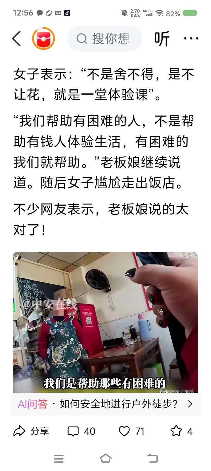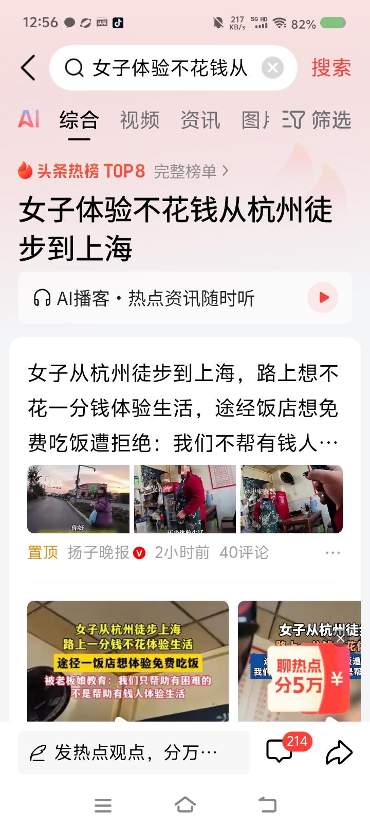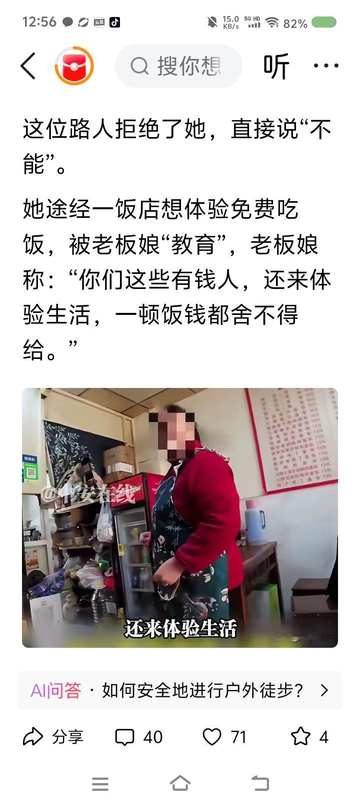 体验生活非得不花钱?—— 据报道,一女子徒步,从杭州到上海,体验“不花钱”,向饭店老板、路边一姑娘求助,均遭拒绝。老板说:“只帮真正有困难的人。” 点评: 评论区很多人认为这个老板与那个姑娘做的对。我也是。 “体验生活”需要成本。毛泽东学生时代曾和同学徒步作调查,能不花钱吗?钱不够了,可以用劳动换取费用。这才是尊重劳动、尊重劳动人民、重视实践的态度。