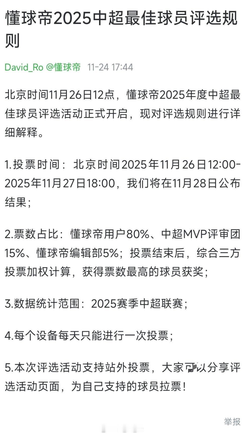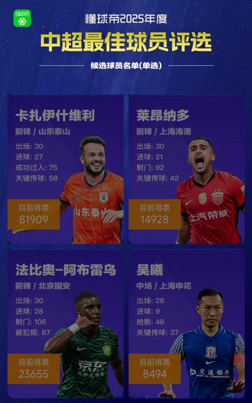 懂球帝2025中超最佳球员评选,瓦科入选。自由橙山东泰山