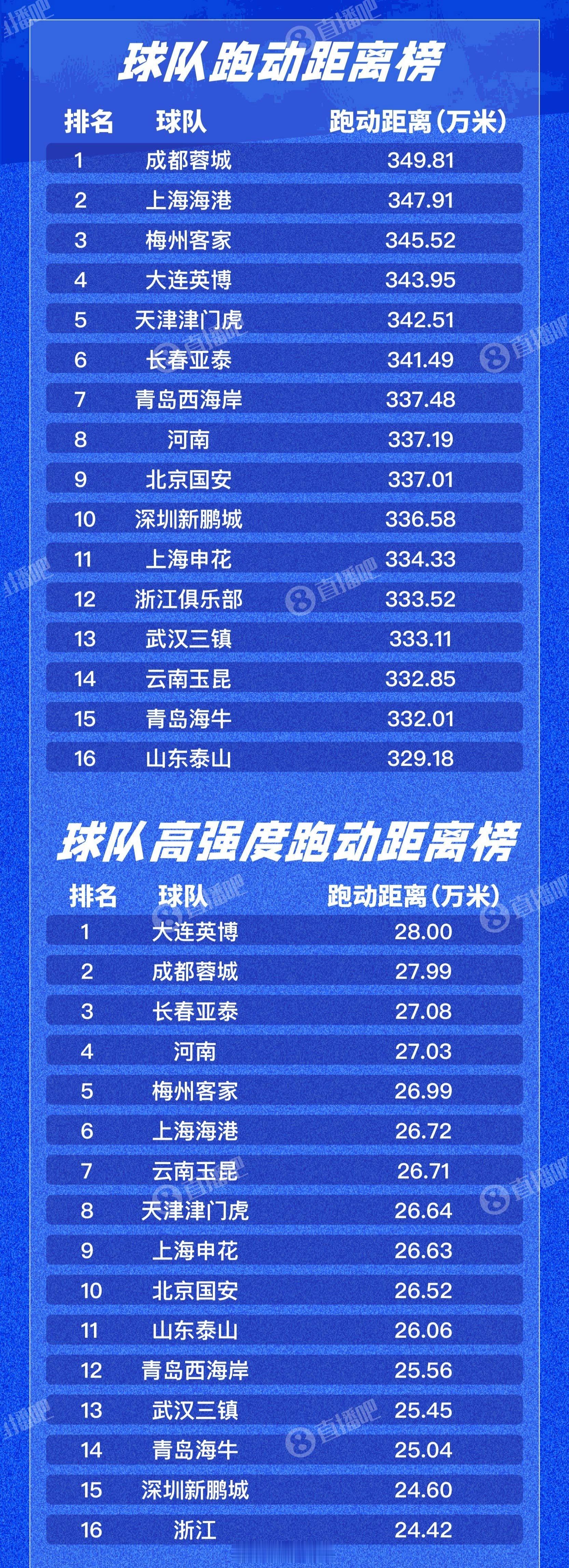 直播吧中超赛季数据盘点,球队跑动距离榜……