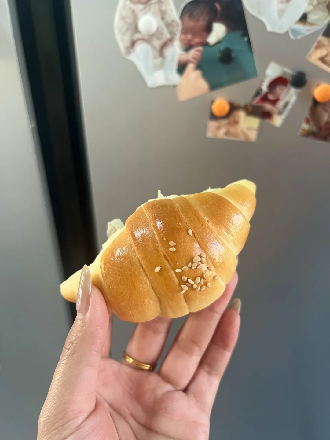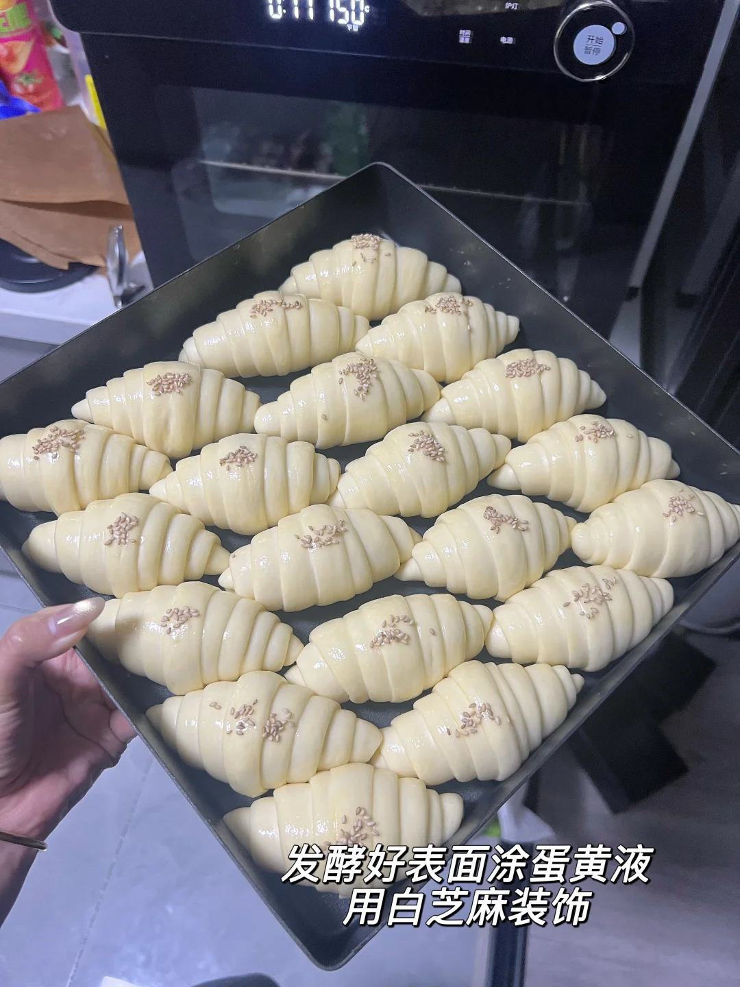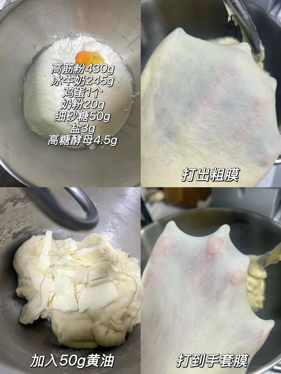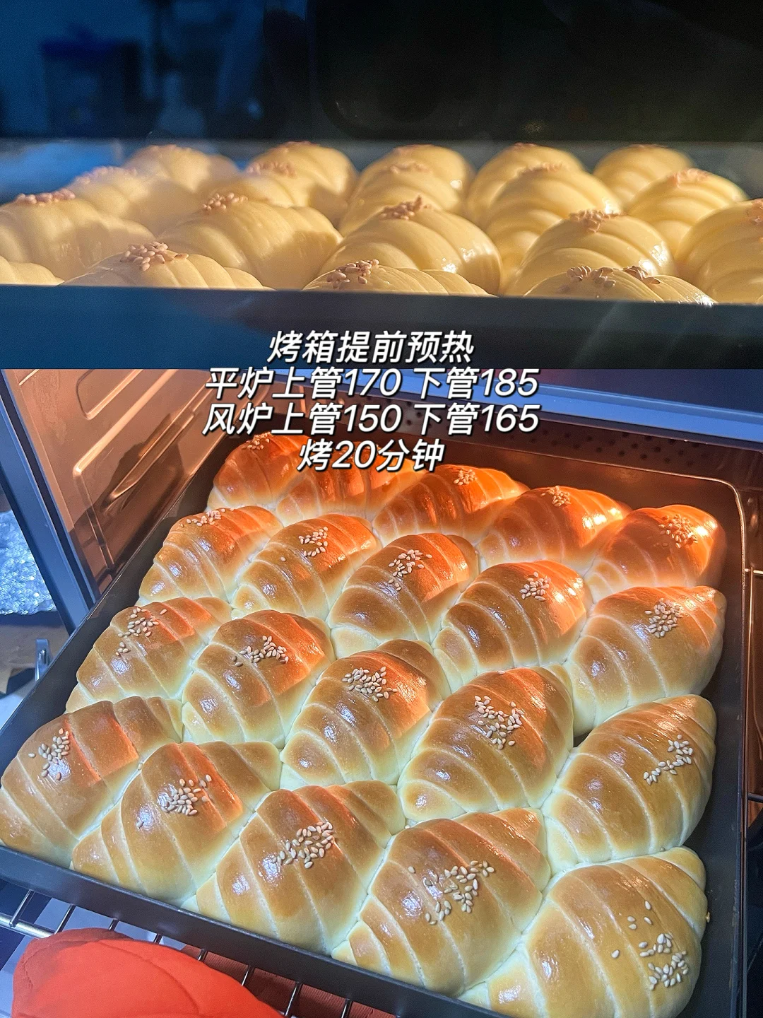 好吃也好看,就是太费腰了[呃R] 不加一滴水,放了很多黄油,奶香味非常浓郁,组织也非常松软,能拉丝那种~ —— ✅食材 高筋粉430g、冰牛奶245g、细砂糖50g、鸡蛋一个、奶粉20g、高糖酵母4.5g、盐3g、黄油50g (另需一个鸡蛋、适量白芝麻装饰 ✅温度:平炉上170下185 20分钟上色满意盖锡纸 风炉上150下165 20分钟