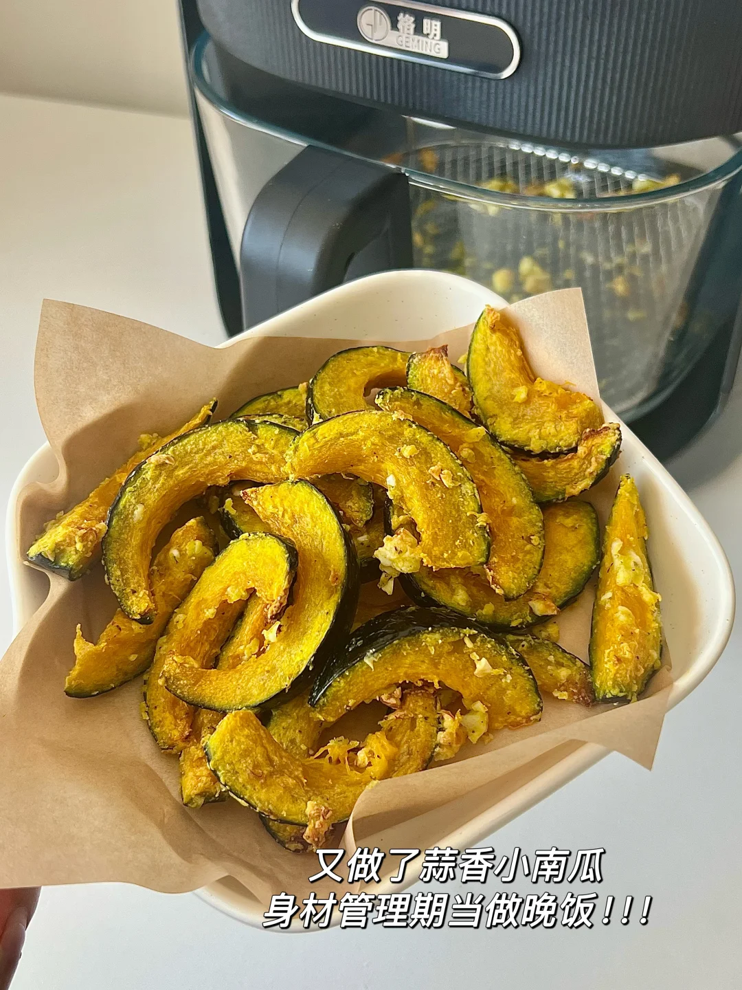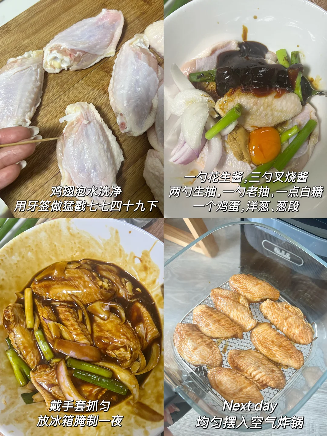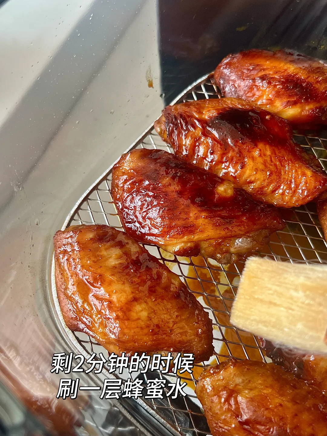 不输烧腊店的叉烧鸡翅也是被我做出来了! ✅食材 鸡翅8个,洋葱小葱适量,花生酱1勺,叉烧酱3勺,生抽2勺,老抽1勺,鸡蛋一个 —— 鸡翅提前泡水,泡出血水,用厨房纸擦干以后用牙签扎七七四十九下,更入味 之前腌制4小时,我一般冷藏一夜 剩最后两分钟的时候刷蜂蜜水,表面更漂亮 这次用了新入手的格明空气炸锅,功率大15分钟就搞定 玻璃内胆我好喜欢,随时观察实物状态,看着食物烤好的过程特别治愈!! 又尝试了一下蒜香小南瓜,当做身材管理期晚饭特别合适~