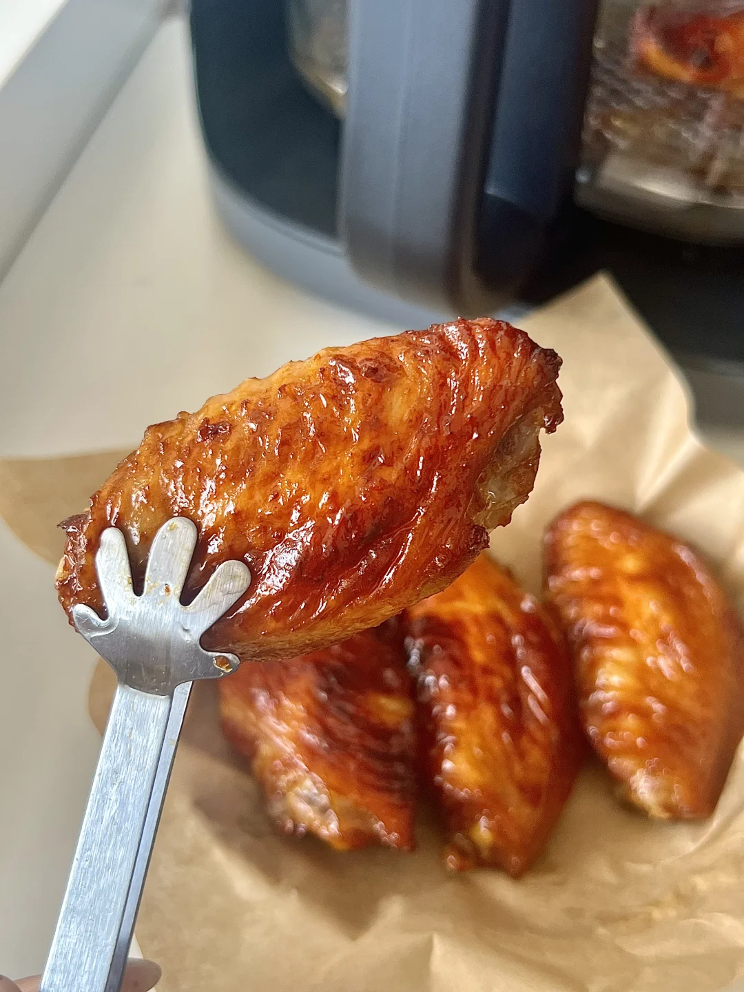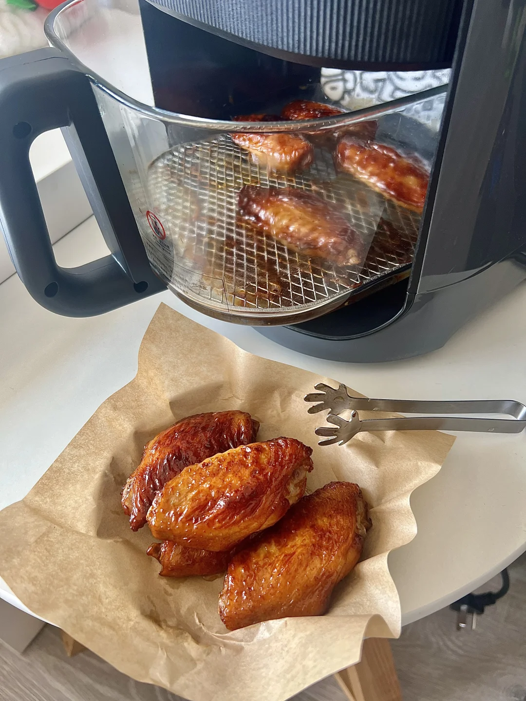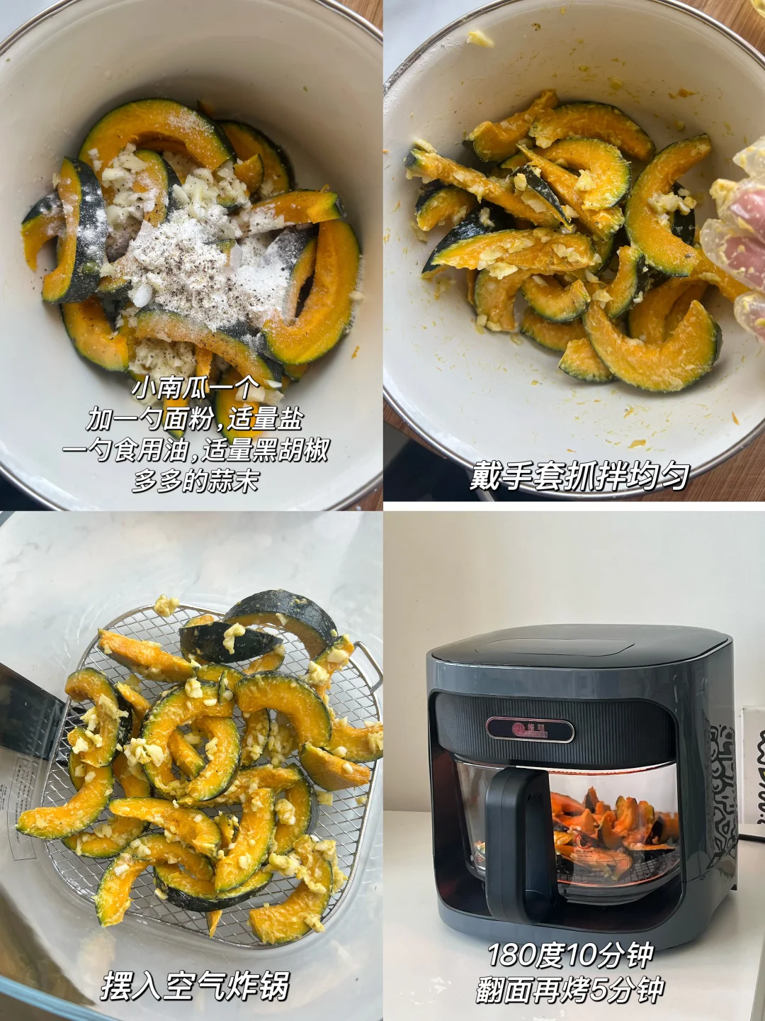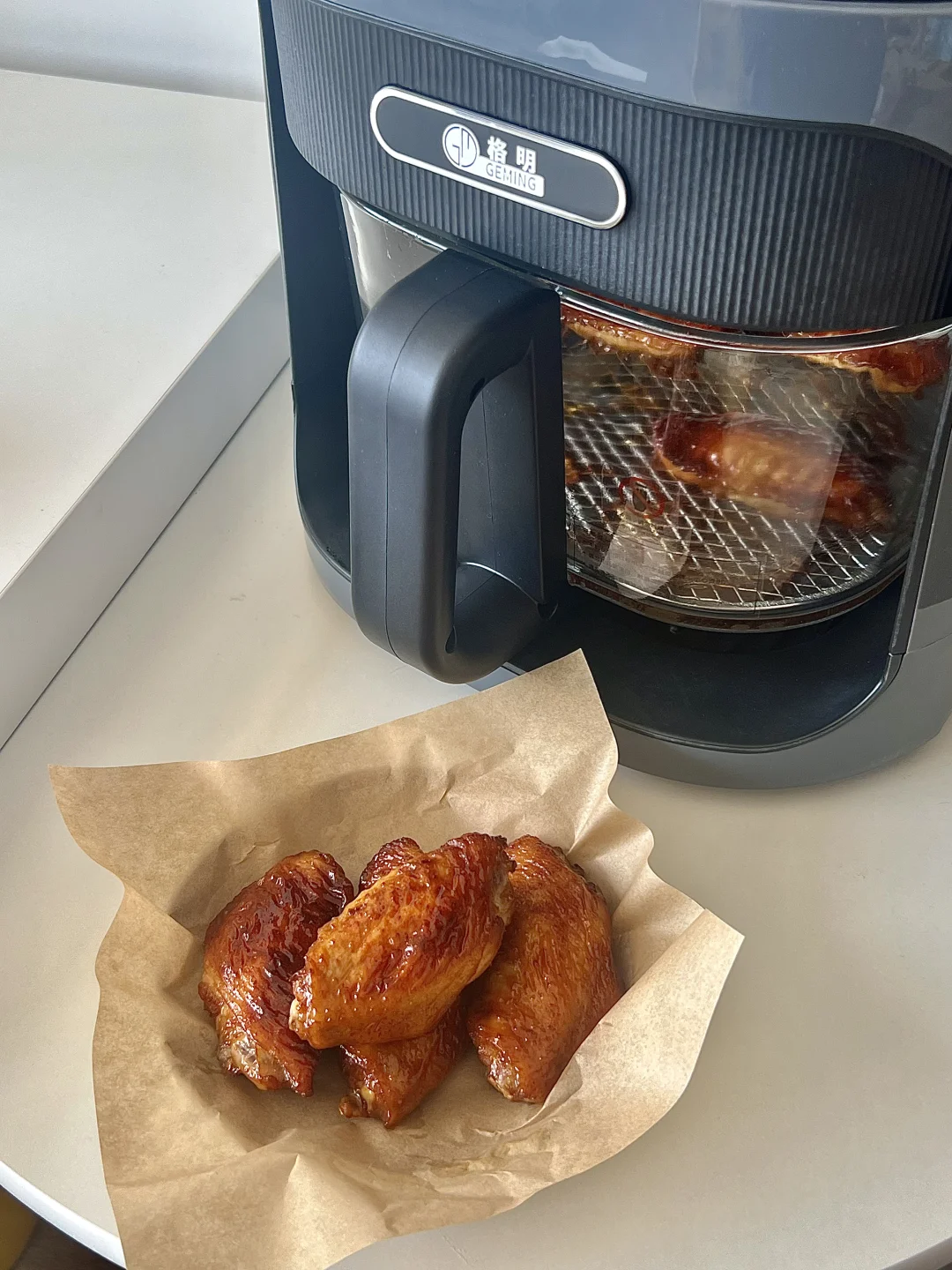 不输烧腊店的叉烧鸡翅也是被我做出来了! ✅食材 鸡翅8个,洋葱小葱适量,花生酱1勺,叉烧酱3勺,生抽2勺,老抽1勺,鸡蛋一个 —— 鸡翅提前泡水,泡出血水,用厨房纸擦干以后用牙签扎七七四十九下,更入味 之前腌制4小时,我一般冷藏一夜 剩最后两分钟的时候刷蜂蜜水,表面更漂亮 这次用了新入手的格明空气炸锅,功率大15分钟就搞定 玻璃内胆我好喜欢,随时观察实物状态,看着食物烤好的过程特别治愈!! 又尝试了一下蒜香小南瓜,当做身材管理期晚饭特别合适~