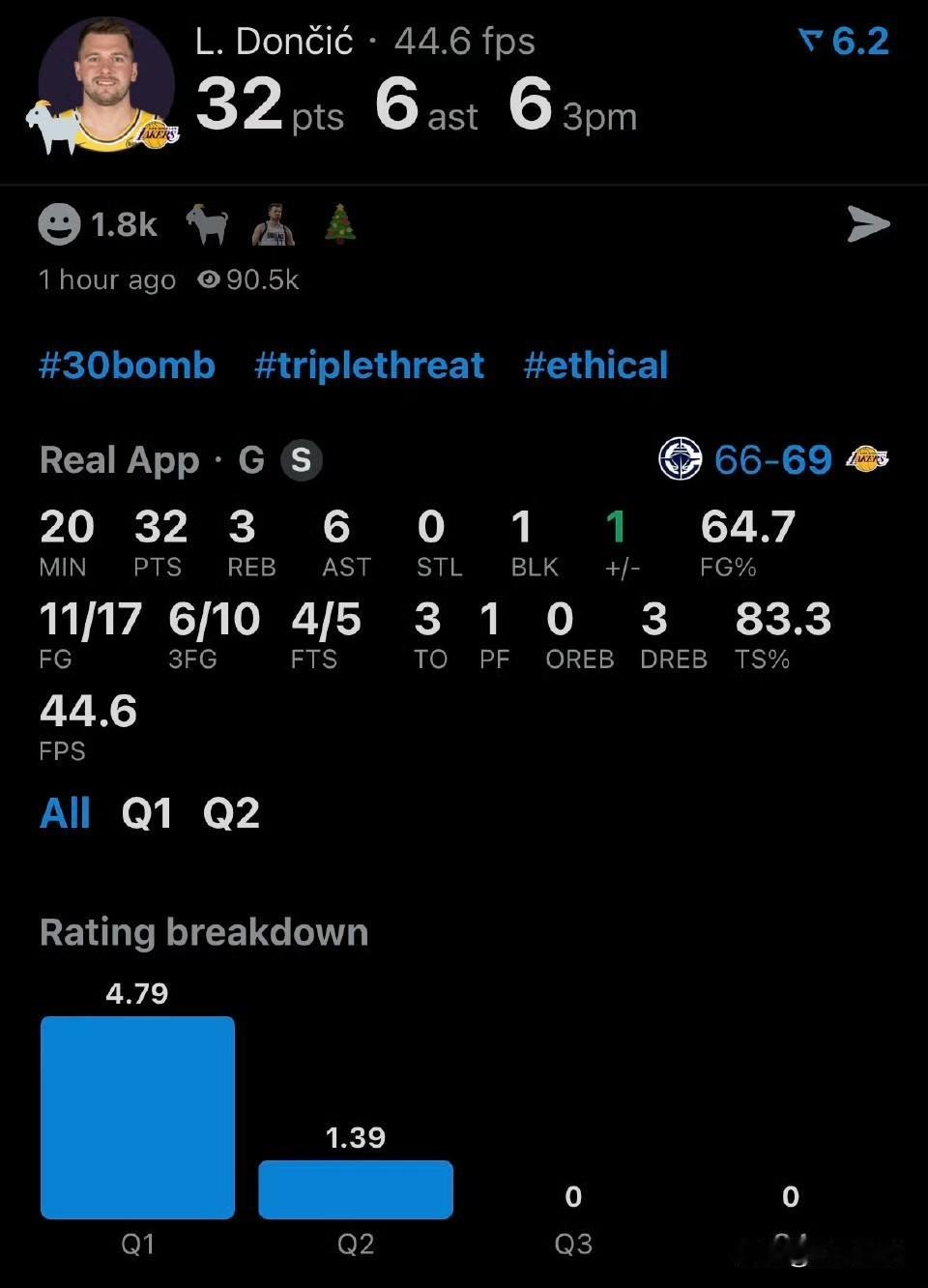 东契奇的祖巴茨瞄准镜又进化了?不需要对着祖巴茨,只要祖巴茨在场也能开自瞄功能? 当然玩笑归玩笑,洛城德比开场快船的进攻效率不错,尤其邓恩给出了一些回应,但东契奇开场三分手感就开张了。联盟得分王本赛季三分手感并不特别夸张,可一旦东契奇开场持球投连续命中,对手对于他的防守策略就会变得格外艰难。 东契奇首节三分已经5投5中独得20分,快船换小阵容依旧无法阻挡他。 双方进入对攻局。双方首节命中率全部超过60%,三分球各自11投6中,对轰出了一个38比37。无论如何,别让今天所有比赛都早早分出胜负就行!