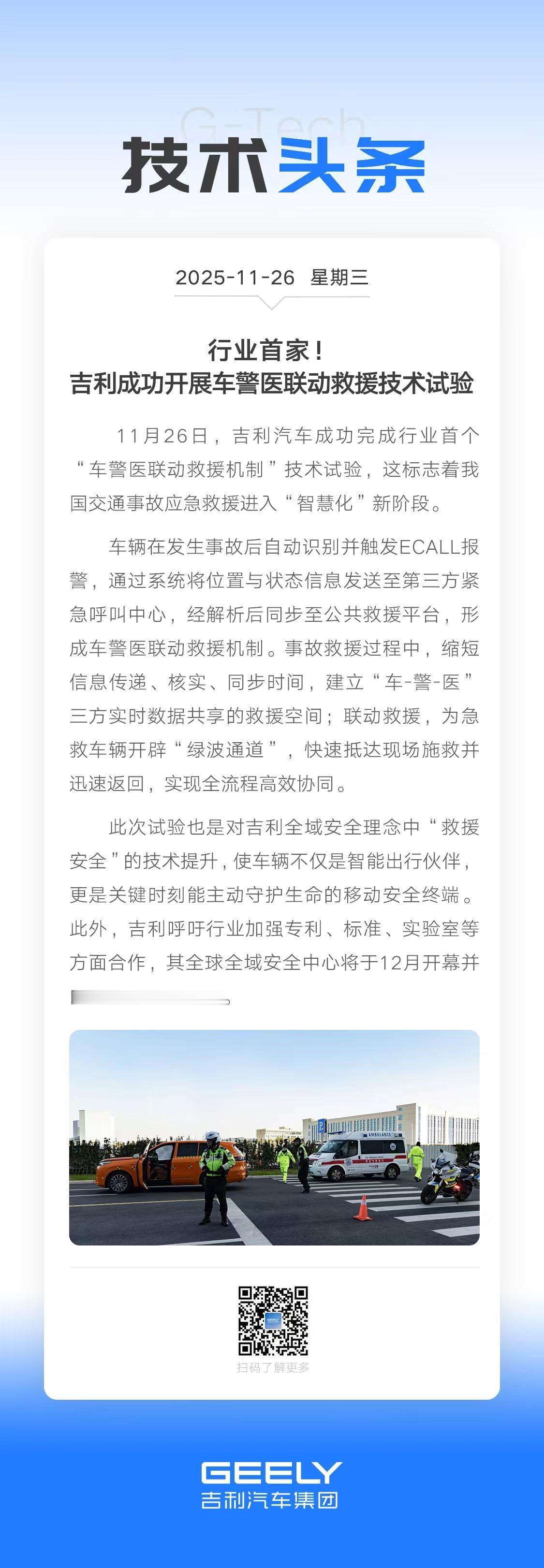 行业首家!吉利成功开展车警医联动救援技术试验 11月26日,吉利汽车成功完成行业