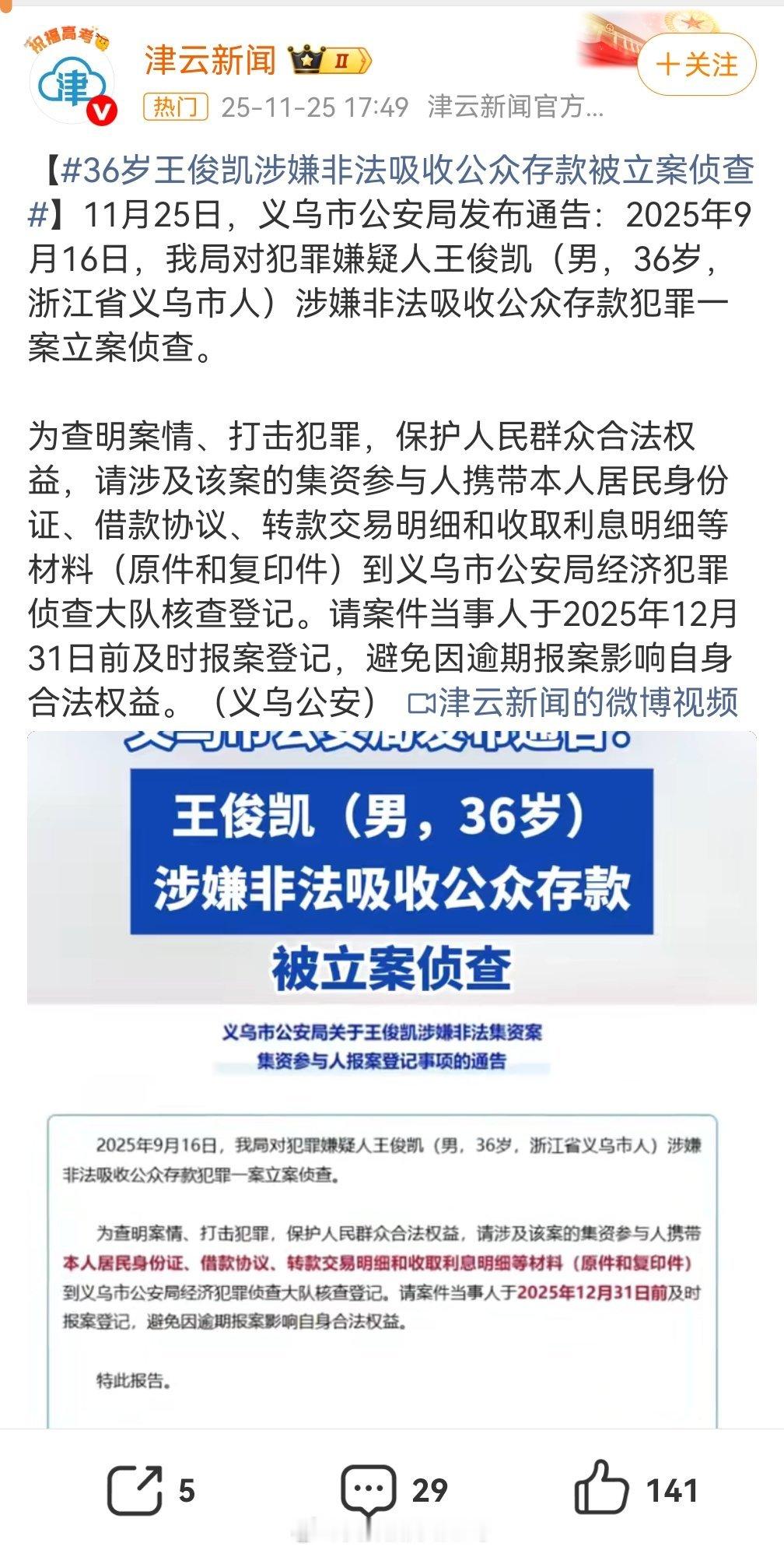 36岁王俊凯涉嫌非法吸收公众存款被立案侦查我记得有个明星叫王俊凯,我还以为是明星出事儿了,这个热搜有点