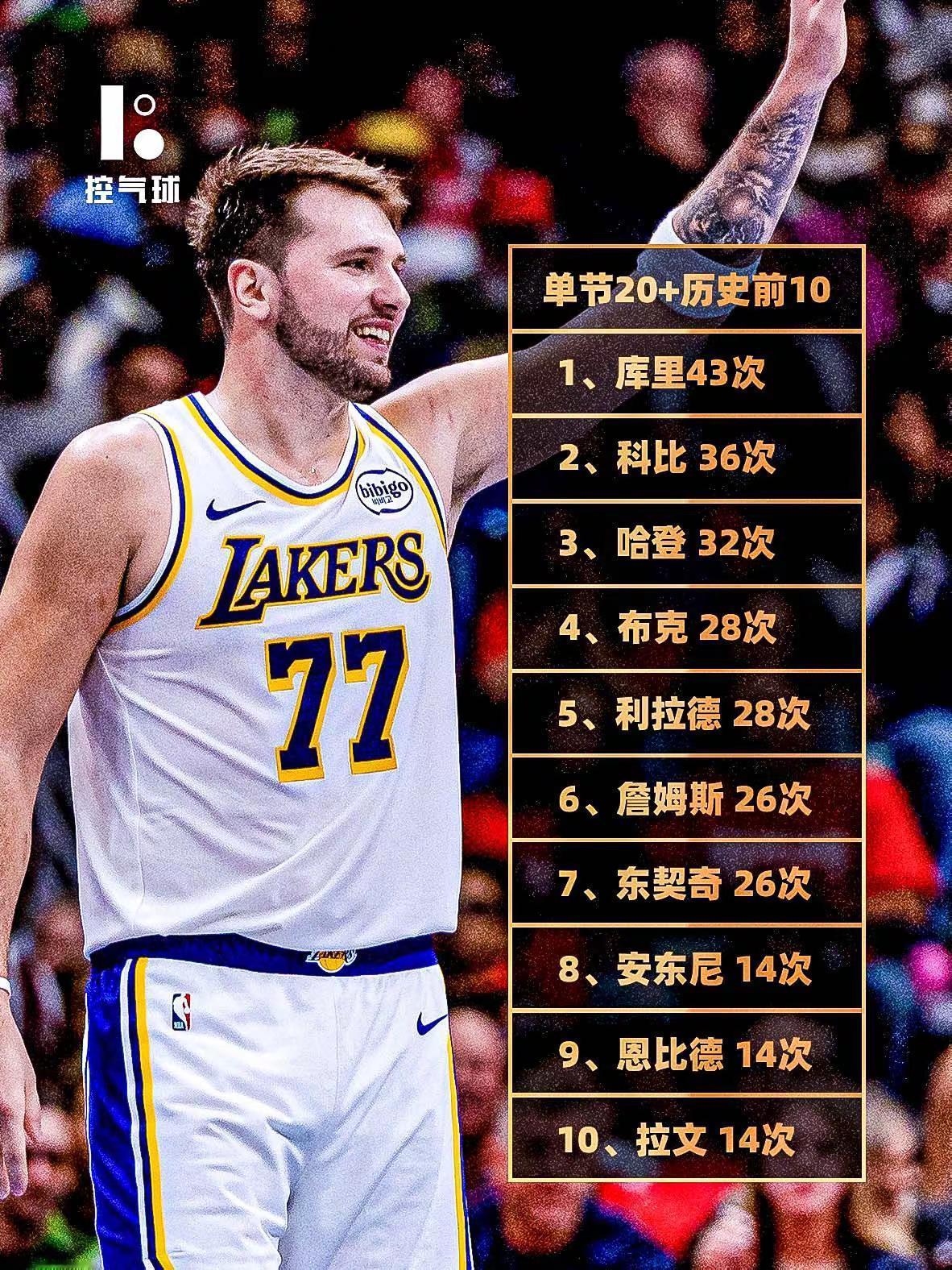 NBA 杯小组赛,湖人主场迎战快船。首节,独行侠东契奇出手 14 次,命中 9 球,单节得 24 分。东契奇职业生涯单节 20 + 场次达 26 次,追平詹姆斯,并列 NBA 历史单节 20 + 排行榜第 6 位。目前,布克和利拉德以 28 次单节 20 + 并列历史第 4 位。东契奇需再得 2 次单节 20+,即可追平布克与利拉德。东契奇詹姆斯 湖人vs快船 东契奇43分准三双