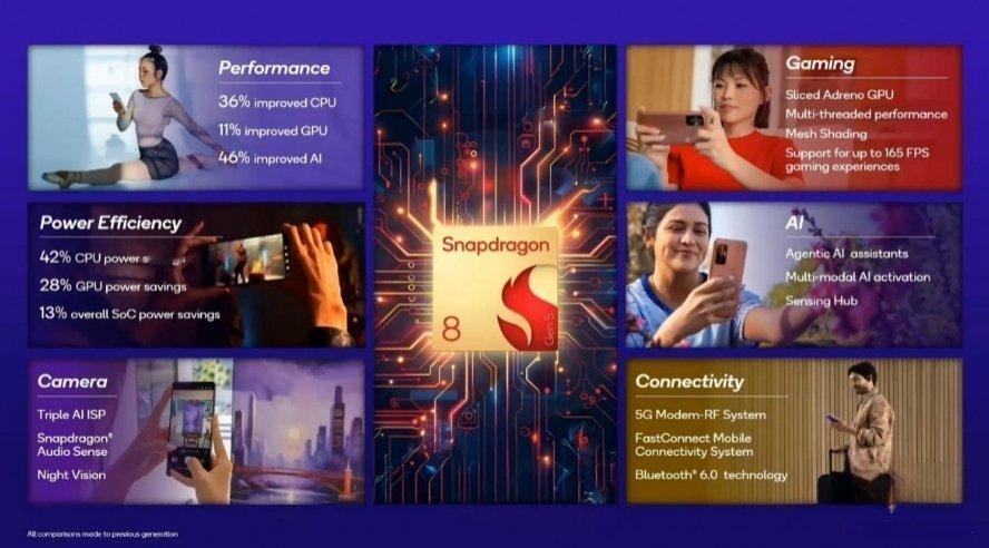 【高通第五代骁龙 8(骁龙 8 Gen 5)处理器发布:CPU 性能提升 36%,一加 Ace 6T 全球首发】高通第五代骁龙 8(骁龙 8 Gen 5)处理器正式发布,旨在为价格较低的设备提供旗舰级体验。与第五代骁龙 8 至尊版(8 Elite Gen 5)一样,骁龙 8 Gen 5 采用 3nm 工艺制造,并配备了高通第三代 Oryon CPU,包括 2 个主频为 3.8 GHz 的 prime 核心和 6 个 3.32GHz 的性能核心。在性能方面,高通将骁龙 8 Gen 5 与两年前的骁龙 8 Gen 3 芯片进行了比较,承诺在 CPU 任务上有 36% 的提升,GPU 提升 11%,AI 任务提升 46%,以及整体 SoC 功耗节省 13%。骁龙 8 Gen 5 配备了与骁龙 8 Elite Gen 5 相同的切片 Adreno 840 GPU 和 Frame Motion Engine 3.0,但没有 Adreno High-Performance Memory(HPM)。骁龙 8 Gen 5 还搭载了高通的 Hexagon NPU,与骁龙 8 Gen 3 相比,在 AI 任务上提升了 46%,支持设备端 AI 和多模态输入。此外,骁龙 8 Gen 5 带来了高通的 Spectra ISP 和 X80 5G 调制解调器-RF 系统 —— 这是去年在骁龙 8 Elite 上使用的调制解调器。一加将全球首发高通骁龙 8 Gen 5 处理器,一加 Ace 6T/15R 将首发搭载该新芯片。