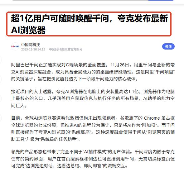 再放大招!阿里千问杀入新领域,或将颠覆市场认知! 刚刚看到消息,阿里千问的顶尖模型能力正式落地到PC端,与全新的夸克AI浏览器深度融合,成为超1亿用户的桌面级智能助理。 这个消息无疑让人倍感期待,此前阿里千问宣布全力进军C端市场,开启千问APP公测,结果仅一周时间,下载量就超过了1000万,增长速度之快甚至超过了ChatGPT这些海外对手。 为什么千问会在C端市场引发如此大的反响?背后是千问对产品的底层能力上进行了系统性重塑,让大家看到了一款强大、好用的AI应用是什么样的。 换句话说,千问已经在移动端证明其作为超级AI应用的影响力和吸引力,一通百通,现在千问进入PC端这一高价值生产力的战场,同样不会让用户失望。 虽然现在市面上所谓的AI浏览器已经有不少了 但是AI在其中的角色更多是一个插件,需要用户自己去选择调用,而千问则直接成为了夸克AI浏览器的系统底座。 区别就在于,用户在夸克AI浏览器的首页搜索框、侧边栏都可以调用千问,甚至在设置“桌面常驻”之后,无需打开夸克AI浏览器就能使用千问读屏、千问截屏、千问划词等实用的AI功能。 想想我们不管是在日常学习中、还是在工作中使用电脑,很多时候都需要进入浏览器,如今有了AI的加持,一切就更方便、更高效了,发展空间势必更大。 说白了,谁能真正把AI深度融入操作系统,实现桌面级的AI原生体验,谁就能在PC端拿到更多的话语权,如今阿里千问与夸克AI浏览器已经率先迈出了最重要的一步。