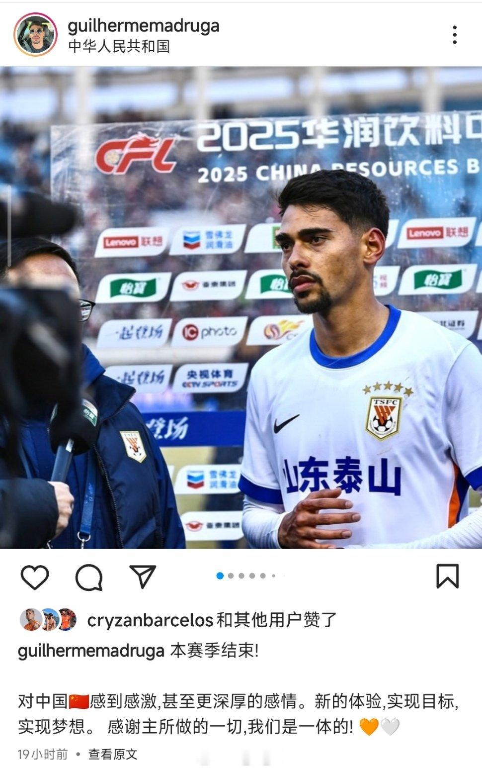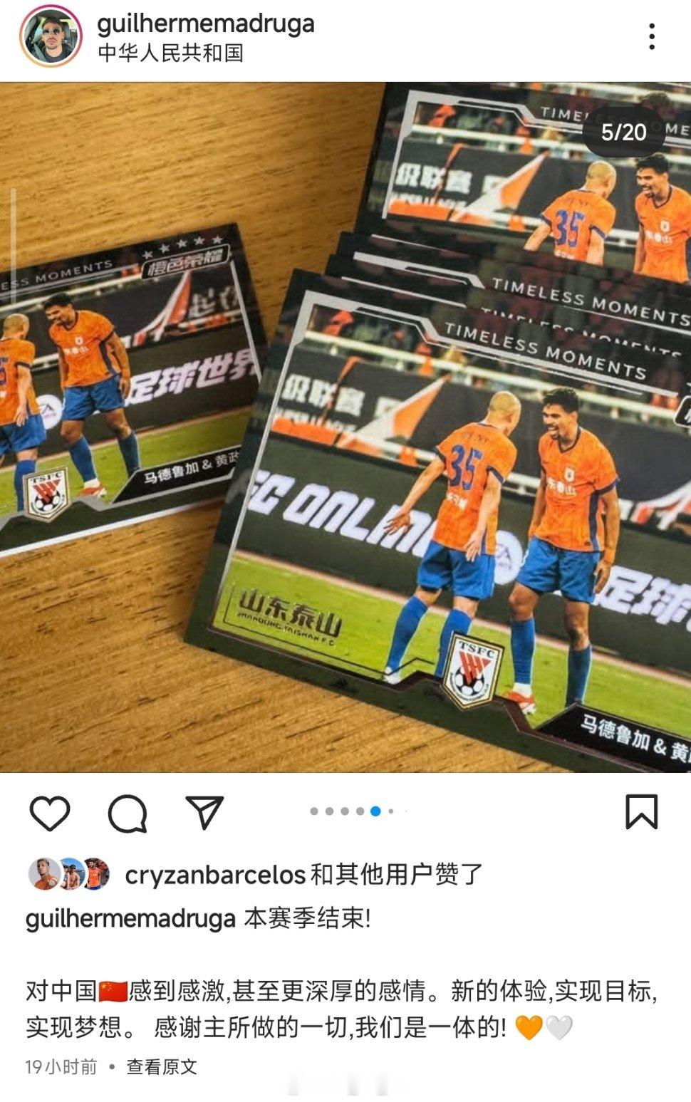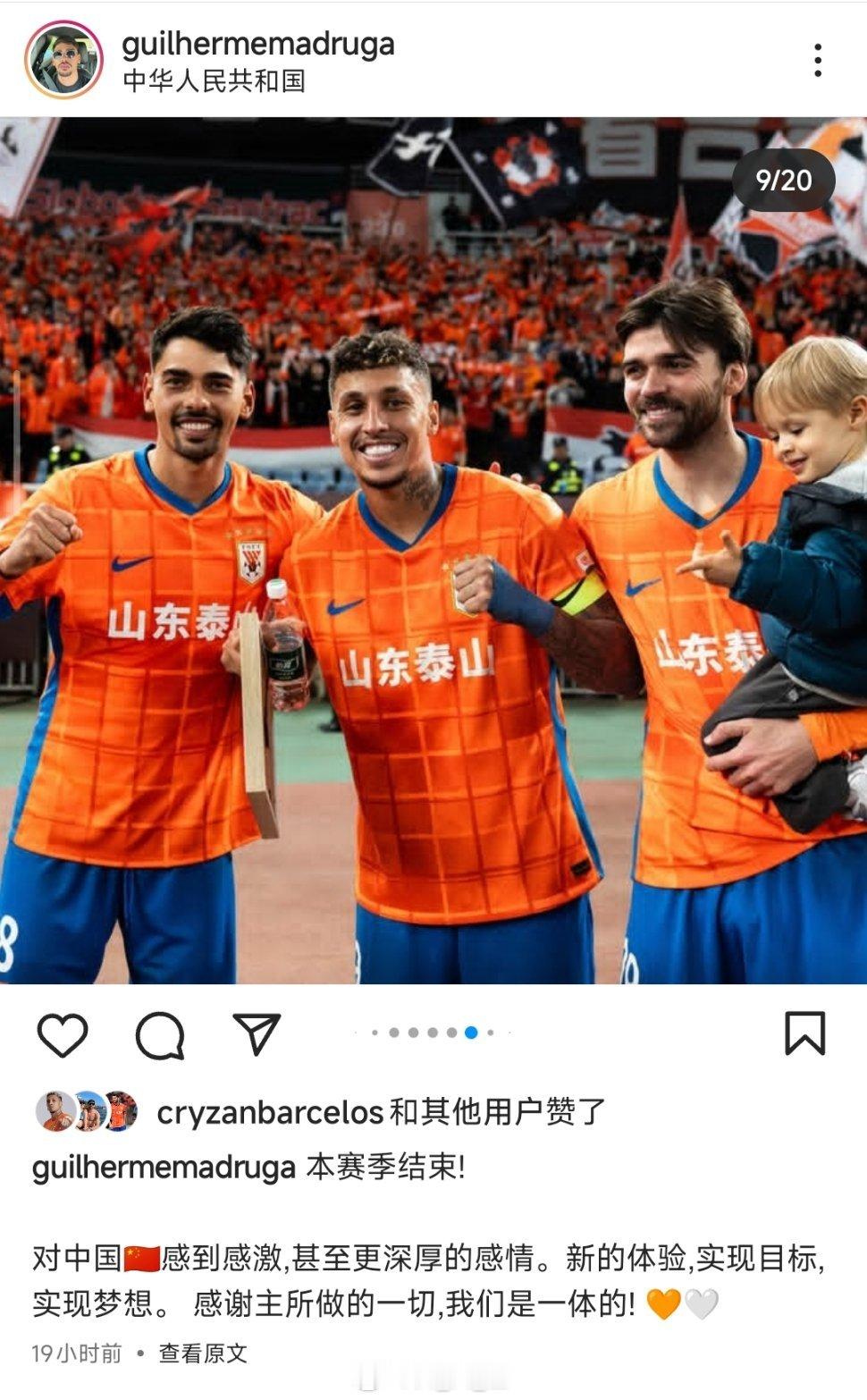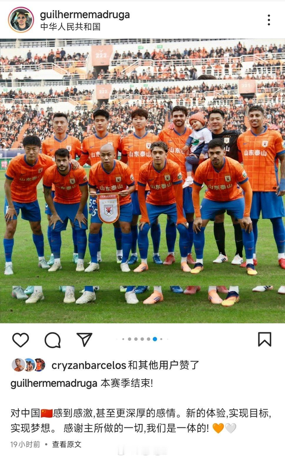 马德鲁加社媒晒照总结赛季自由橙山东泰山
