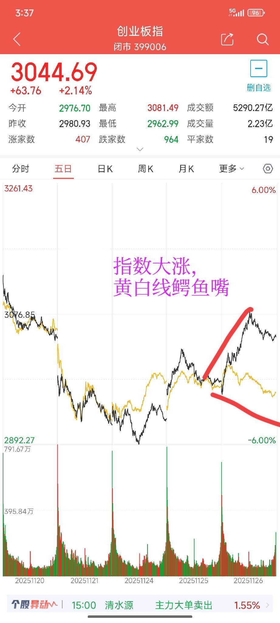 又是反弹却不想带上咱们散户的节奏! 连续三天反弹,黄线于今日下午13:30下穿白线,这是否预示着大部分股票的反弹就此结束? 创业板的情况更为夸张,黄白线走出了“鳄鱼嘴”形态,“易中天”等大票再度大幅上涨。 随着午后冲高回落,大盘再度收于5日线之下。大票再创新高,小票接下来创新低的可能性增大。尾盘有资金明显抄底,明日需关注大盘是放量站上五日线,还是砸盘终结此次反弹。