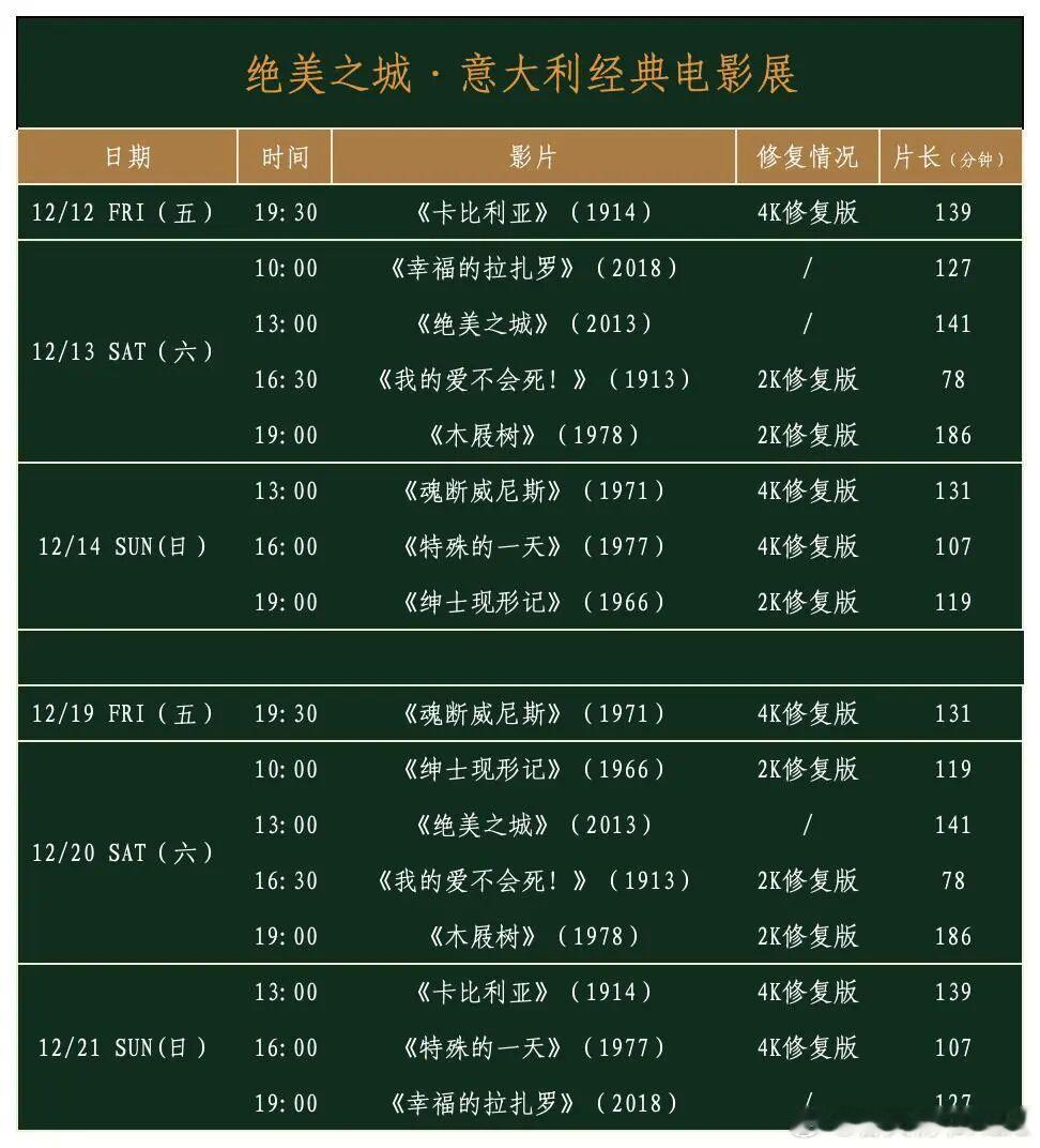 上海电影博物馆将于12月12日-21日举办绝美之城·意大利经典电影展。11月28日(周五)中午12:00开票。展映片单:《我的爱不会死!》(1913) 《卡比利亚》(1914) 《绅士现形记》(1966) 《魂断威尼斯》(1971) 《特殊的一天》(1977)《木屐树》(1978)《绝美之城》(2013)《幸福的拉扎罗》(2018)