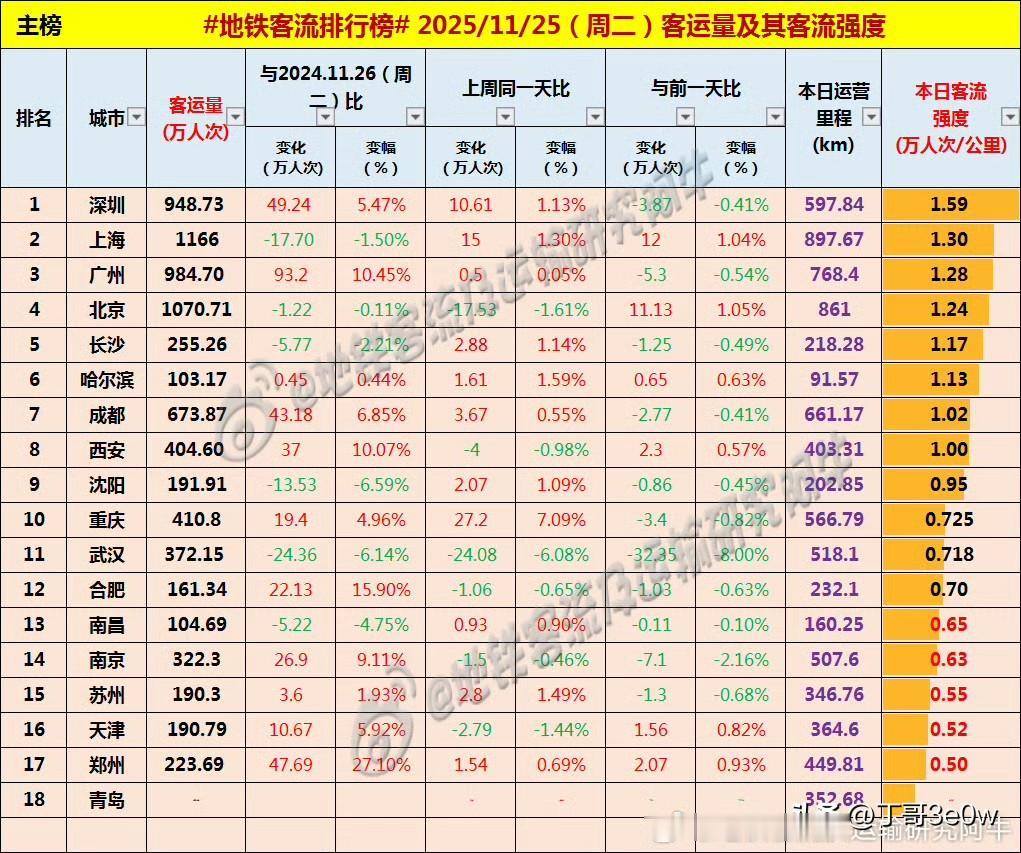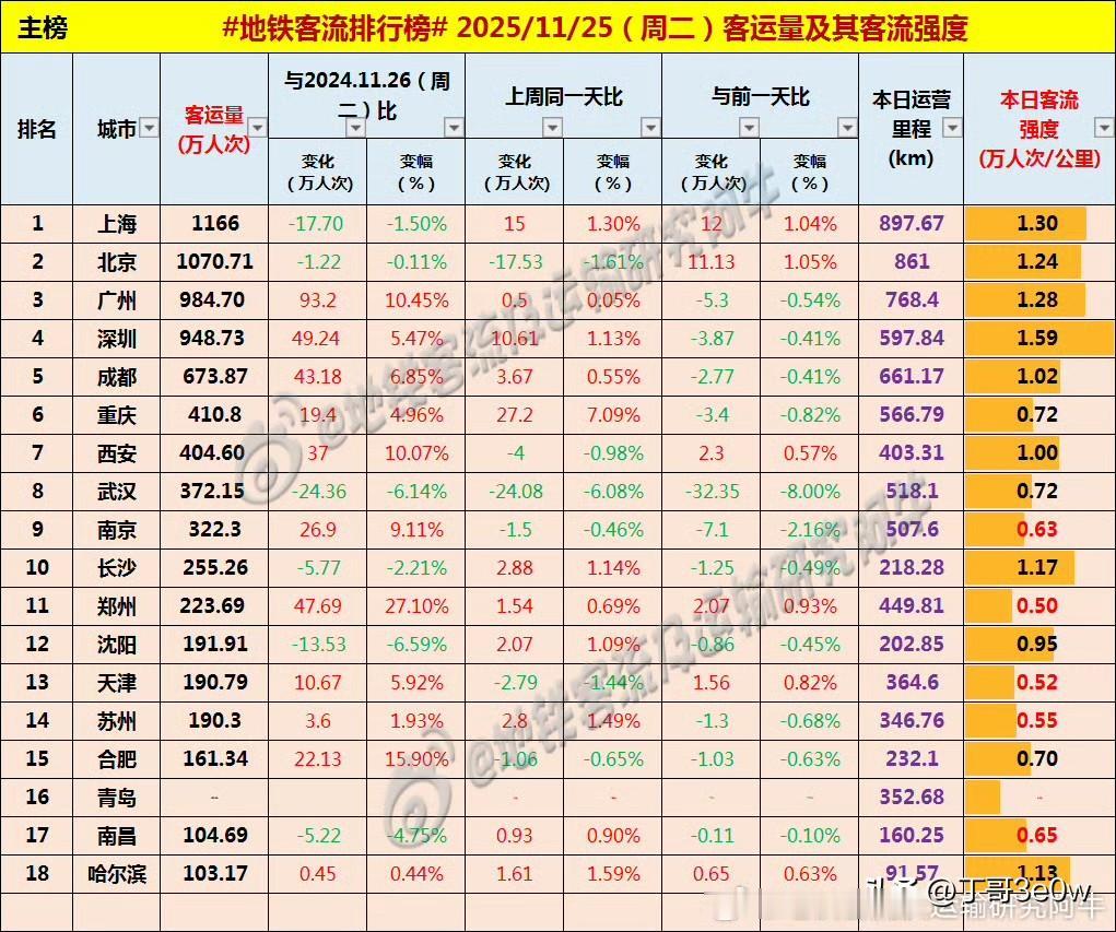 沈阳、天津、苏州周二地铁客流量非常接近,都为190万人次左右[呲牙][呲牙][呲牙] 爆料 身边事 2025年11月25日 星期② 全国重点城市轨道交通客流量排行榜: 上海:1166.00万 北京:1070.71万 广州:984.70万广州地铁 深圳:948.73万深圳地铁 成都:673.87万 重庆:410.80万重庆身边事 西安:404.60万西安爆料 武汉:372.15万武汉地铁 南京:322.30万 长沙:255.26万长沙身边事 郑州:223.69万郑州爆料 沈阳:191.91万 天津:190.79万天津身边事 苏州:190.30万苏州地铁 合肥:161.34万合肥爆料 青岛:100万+ 南昌:104.69万江西南昌身边事 哈尔滨103.17万