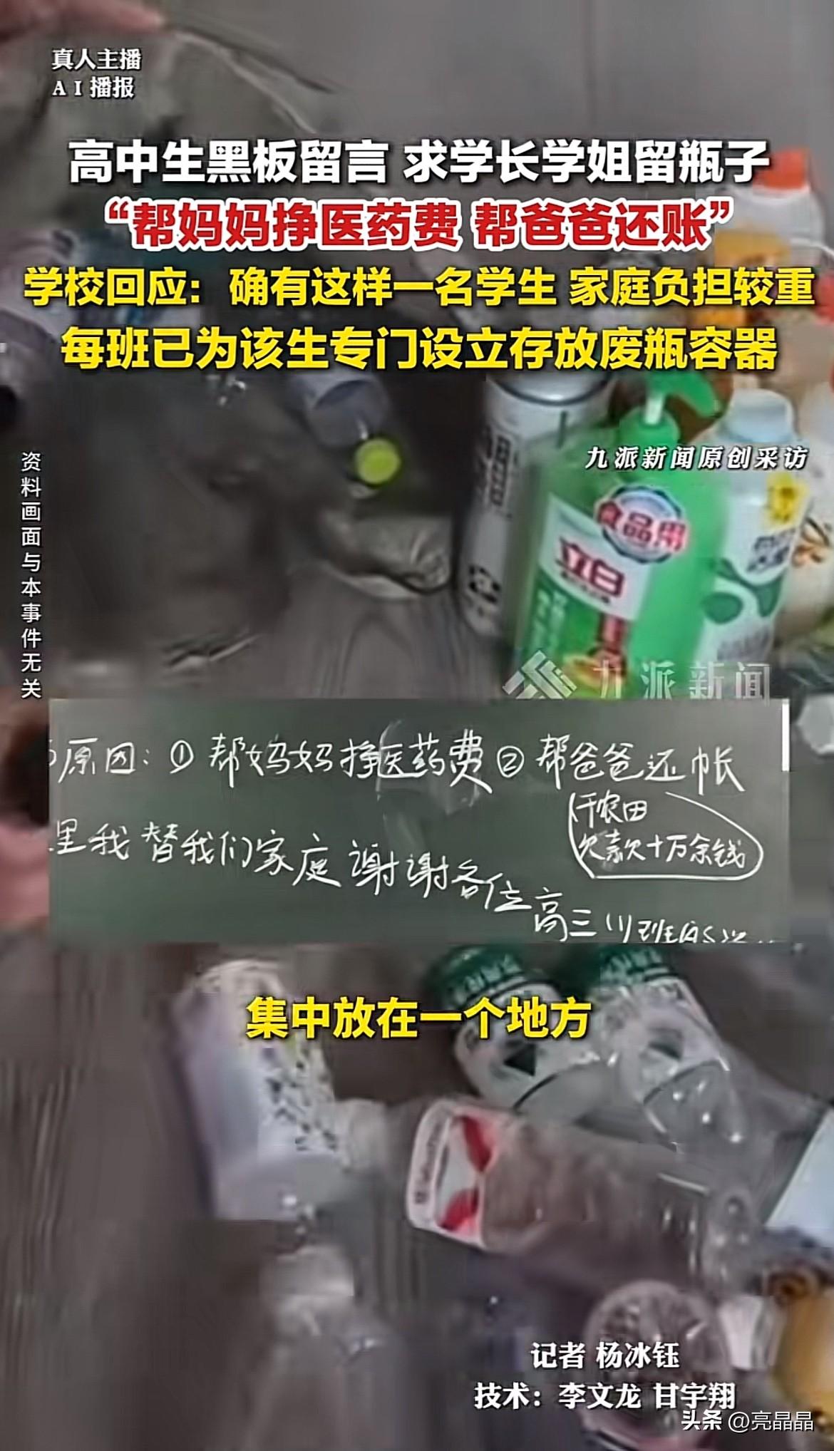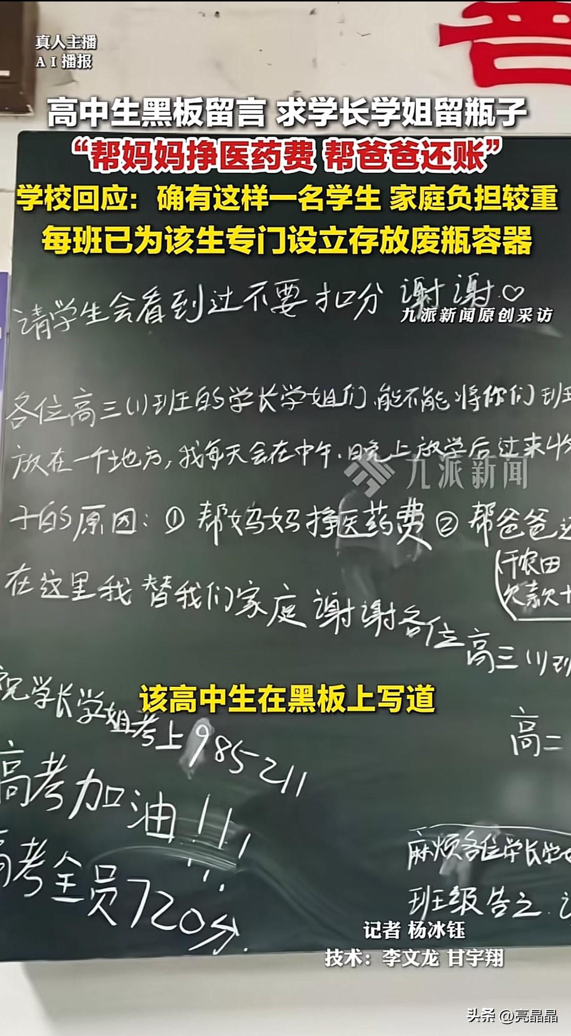 看哭了!安徽高中生为妈妈挣医药费,替爸爸还债,给学长学姐黑板留言求助,直白又坦荡赢得大家的支持。 “请学生会看到不要扣分,谢谢❤️ 各位高三(1)班的学长学姐们,能不能把你们的瓶子放在一个地方,我每天在中午、晚上放学后过来收。 收瓶子的原因:1️⃣帮妈妈挣医药费 2️⃣帮爸爸还账(干农田欠下10万余元) 在这里我替我们家庭感谢各位高三(1)班的学长学姐们! 祝学长学姐考上985 211,高考加油!!!高考全员720分。” 字字戳心,求助的同时还不忘提醒学生会不要扣分,生怕自己的留言影响学长学姐班级扣分,最后还不忘预祝学长学姐高考顺利!真的很暖心的孩子。 自尊心极强的年纪,不怕同学取笑,真诚的留言感动了同学,也感动了学校,学校为其专门准备了存放瓶子的容器,且提供贫困学生资助。 莫欺少年穷,这个学生好样的!勇于承担家庭责任,不自卑不抱怨,积极寻找办法解决,有学生时代的纯真,更有少年自强自立的勇气和担当! 祝愿这位少年学业有成,高考金榜题名,改写自己的生活和命运。 学校回应贫困学生黑板留言收废瓶