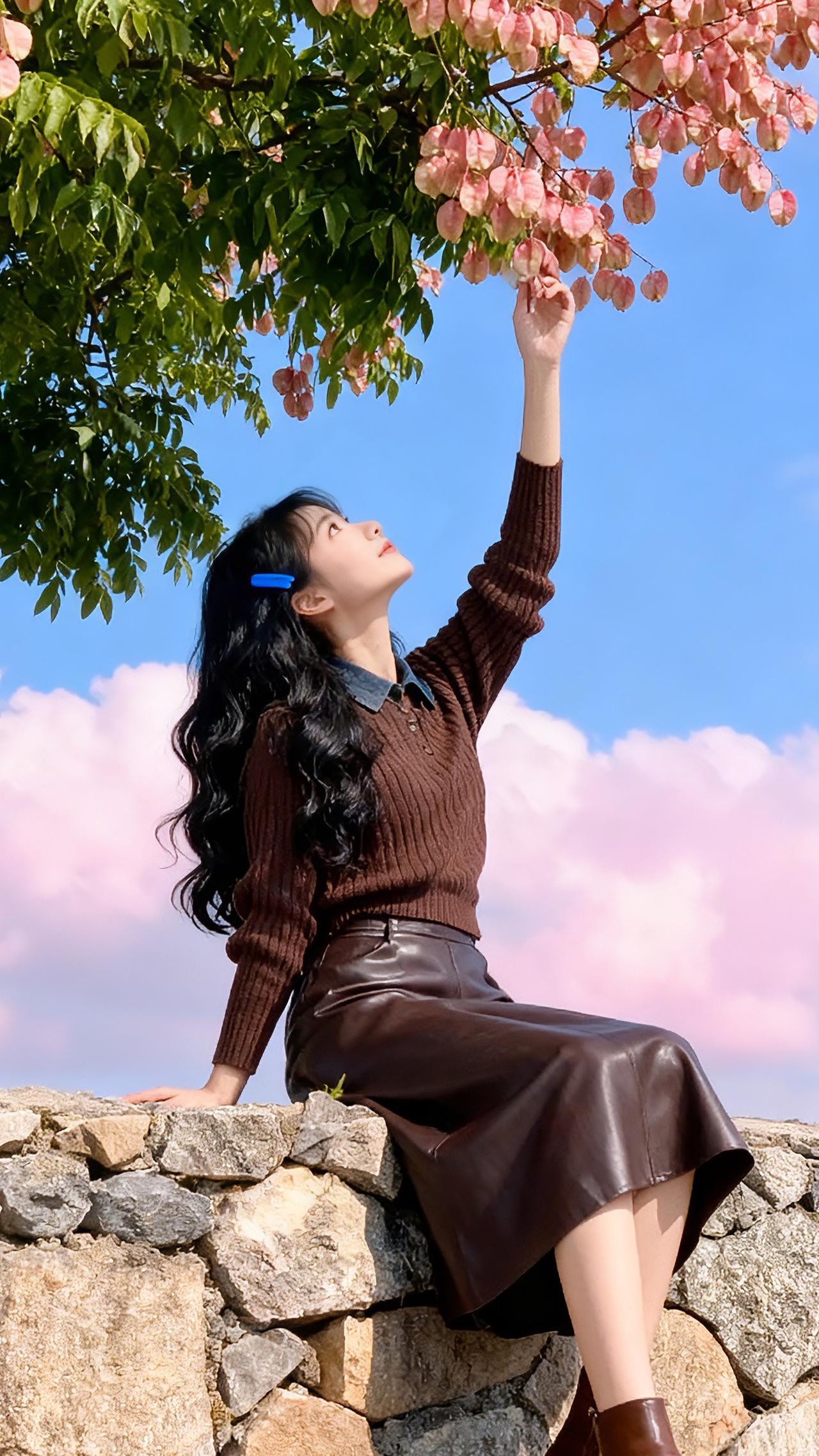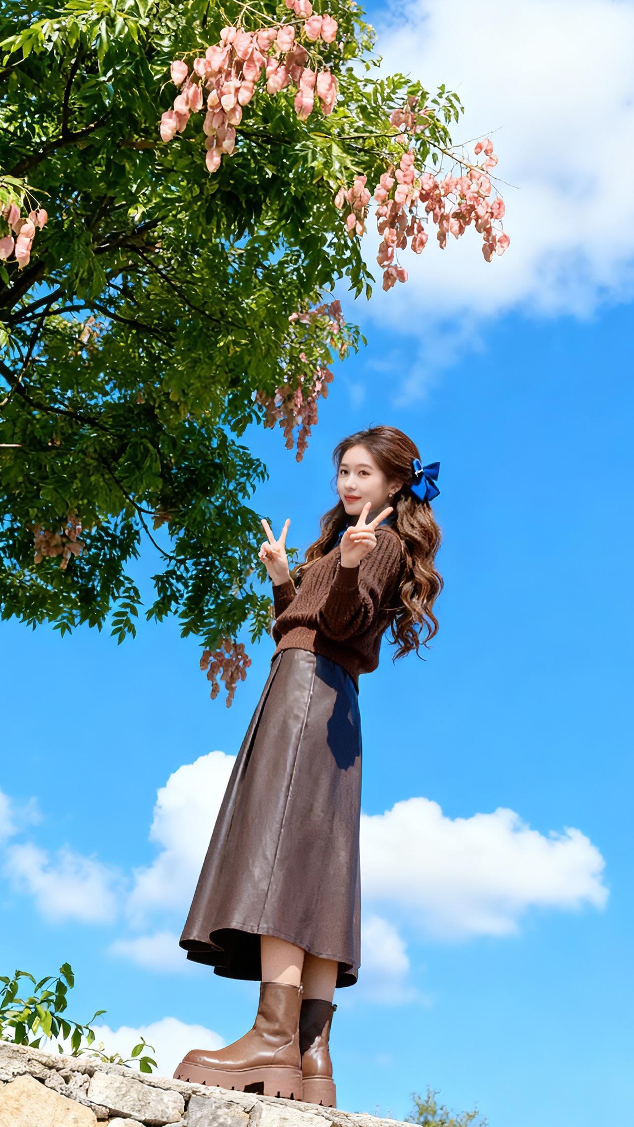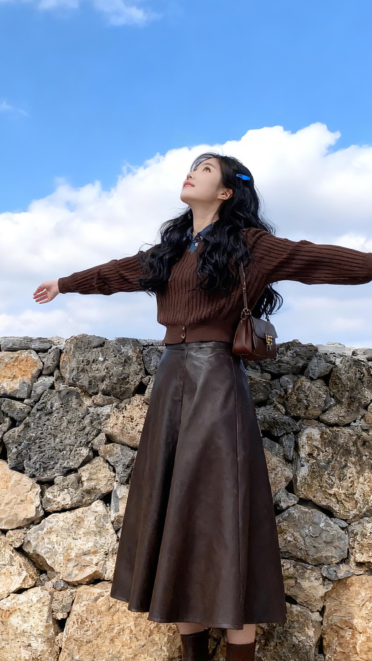 秋季气质一整套穿搭欧货复古牛仔领拼接假两件毛衣 高腰半身裙套装
