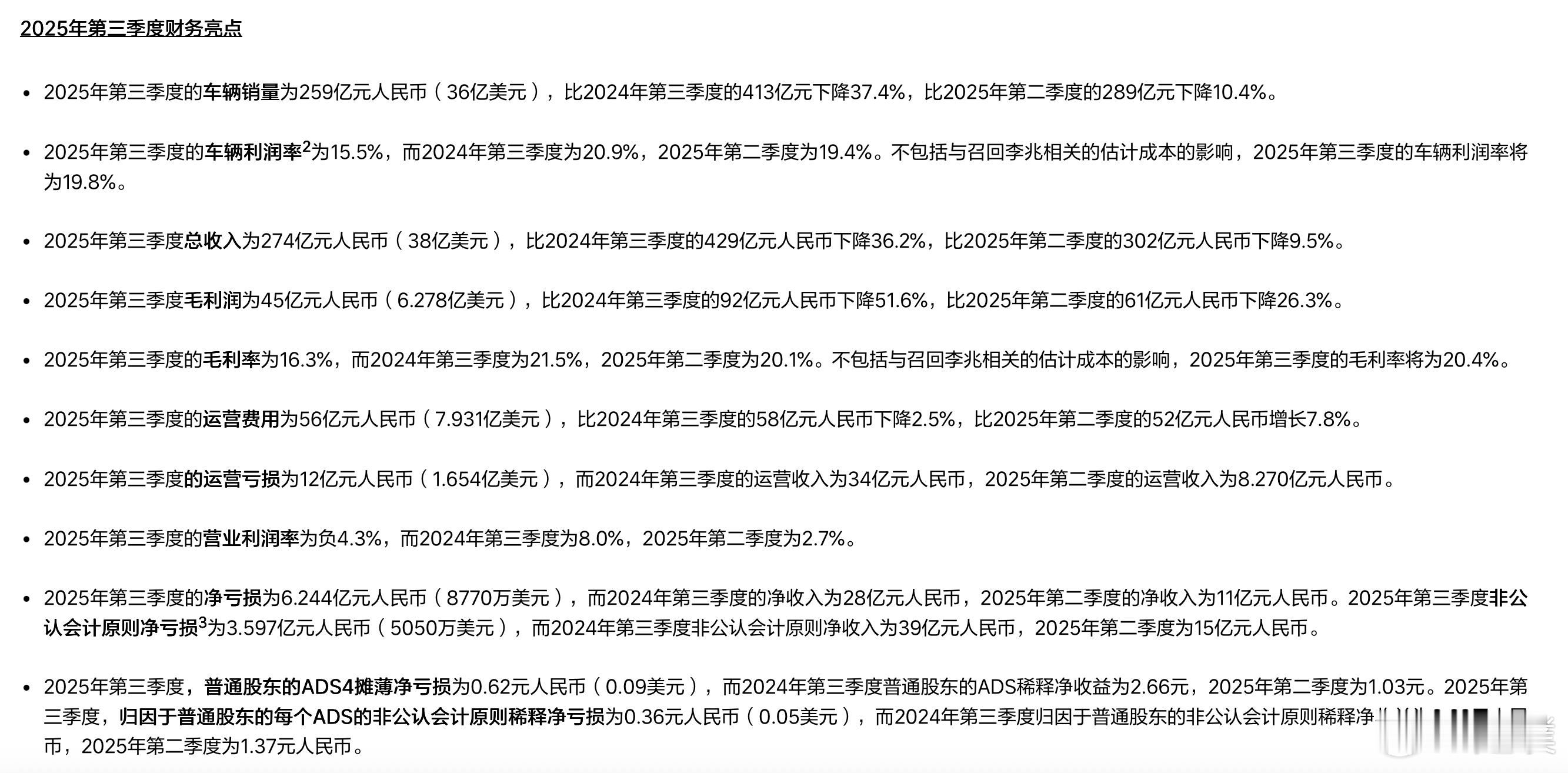 理想第三季度财报发布:2025年第三季度收入总额为人民币274亿元,较2024年第三季度的人民币429亿元减少36.2%,较2025年第二季度的人民币302亿元减少9.5%。第三季度汽车总交付量为93211辆,同比减少39.0%。预计四季度车辆交付量在10万辆到11万辆之间,总收入在265亿元人民币(37亿美元)至292亿元人民币(41亿美元)之间。理想汽车理想i6