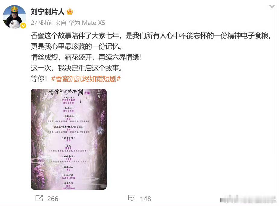 香蜜小说原作者辟谣改编短剧制片人官宣香蜜短剧 近日,网传 《香蜜沉沉烬如霜》要改编为短剧,引发讨论。25日,小说原作者辟谣,称完全不知道、没听过香蜜要被改成短剧的消息。26日,香蜜制片人发布香蜜短剧版组讯,并称:“情丝成烬,霜花盛开,再续六界情缘!这一次我决定重启这个故事”。