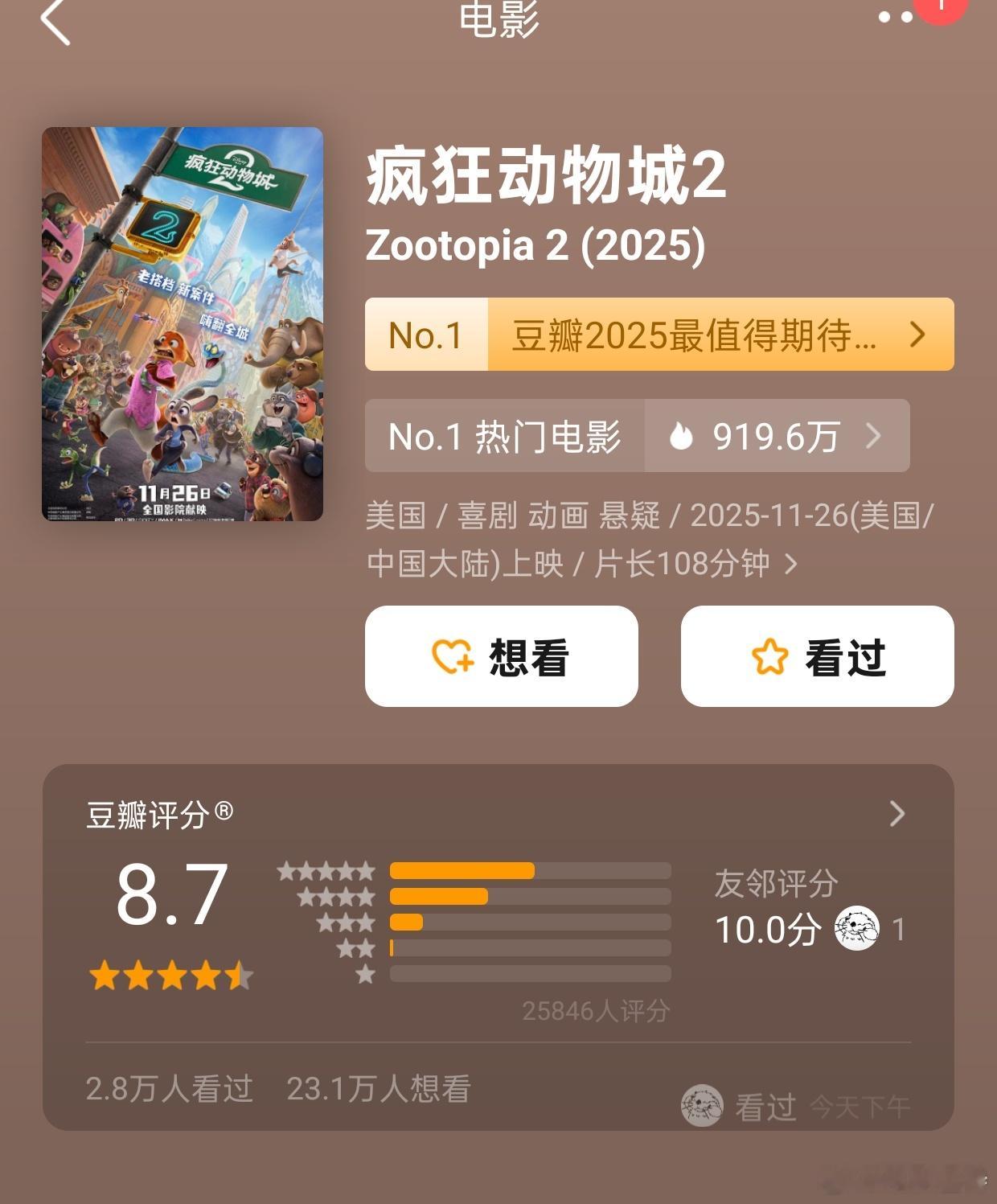 疯狂动物城2豆瓣开分8.7分。
