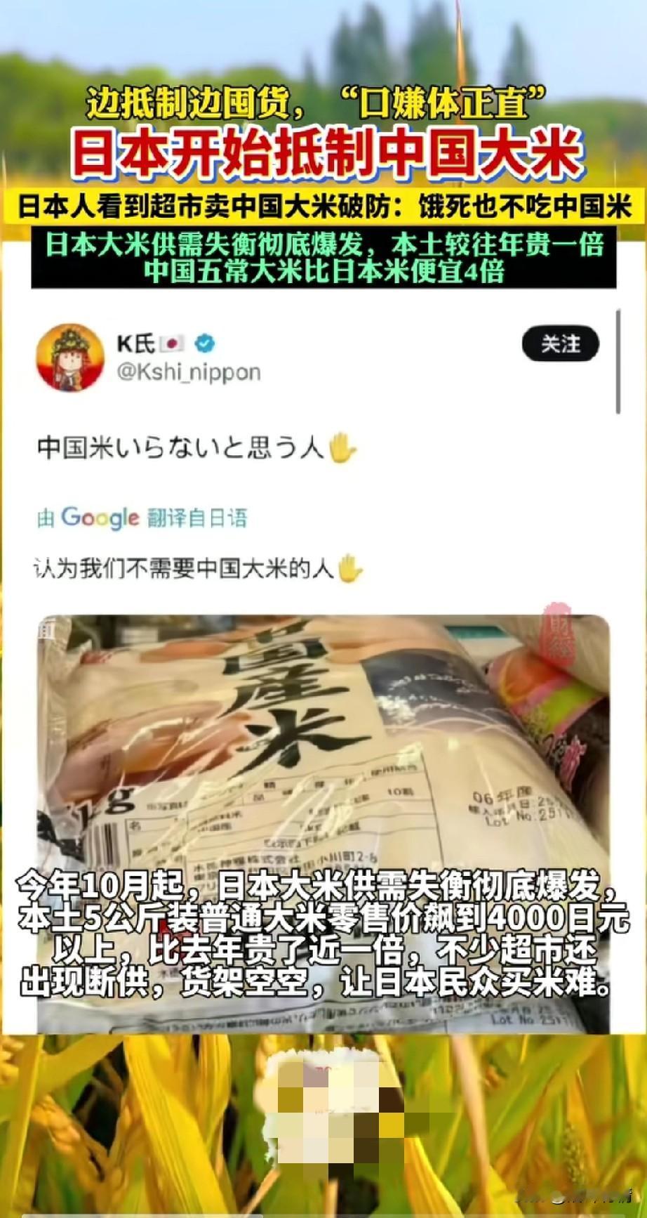 日本人抵制中国大米, 口号喊的冲天响, 超市的大米却频繁抢空, 还真让人哭笑不得, 日本本地大米短缺, 只好进口中国大米填补国内市场空缺, 民间知道后掀起了一场抵制中国大米的浪潮,关键是中国五常大米比日本本土大米便宜四倍, 日本民众在超市看到卖中国大米直接破防,还表示饿死不吃中国米, 结果自己抢的比谁都快, 还真是心口不一的民族, 所以说不要看他们说了什么, 要看他们做了什么, 大家对于日本民众嘴上喊抵制中国大米,实际上比谁都抢的快这事怎么看? 日本米价格暴涨 日本米价格 日本买大米 日本产米 日本米价风波 日本米 日本缺大米