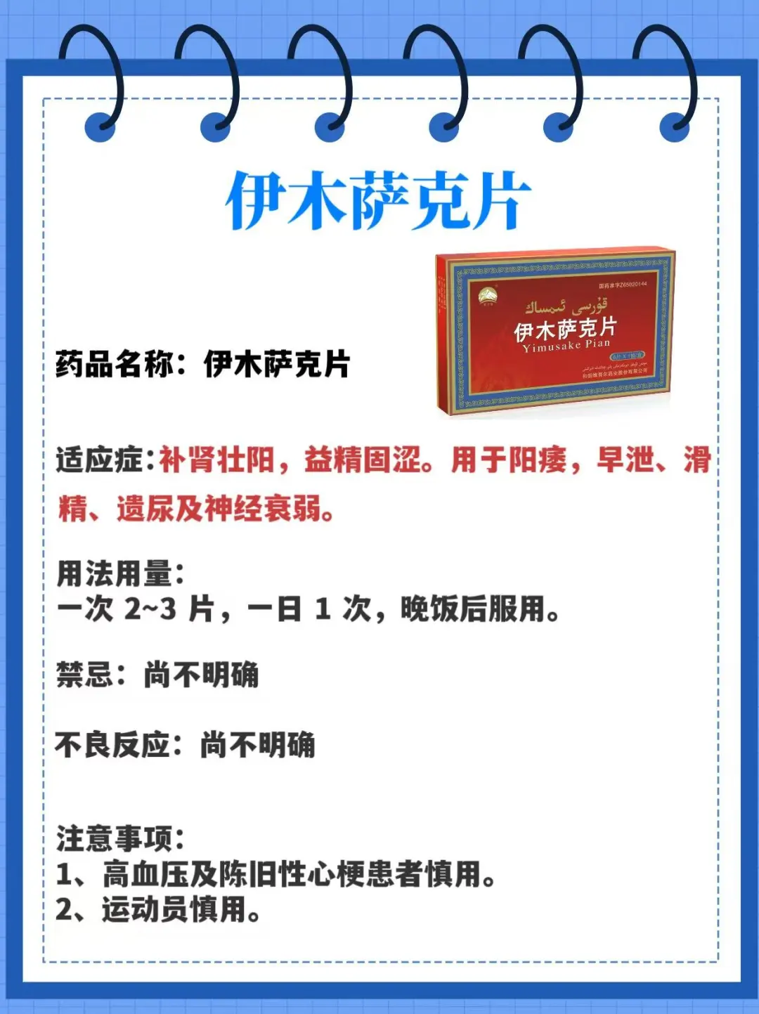 今日学习打卡➡️伊木萨克片 主要成分:欧白及、人工麝香、龙涎香、西红花、马钱子(制)、乳香、牛鞭、肉豆蔻、丁香、罂粟壳、高良姜。 适应症:补肾壮阳,益精固涩。用于阳痿,早泄,滑精,遗尿及神经衰弱。 注意事项: 1、高血压及陈旧性心梗患者慎用。 2、运动员慎用。