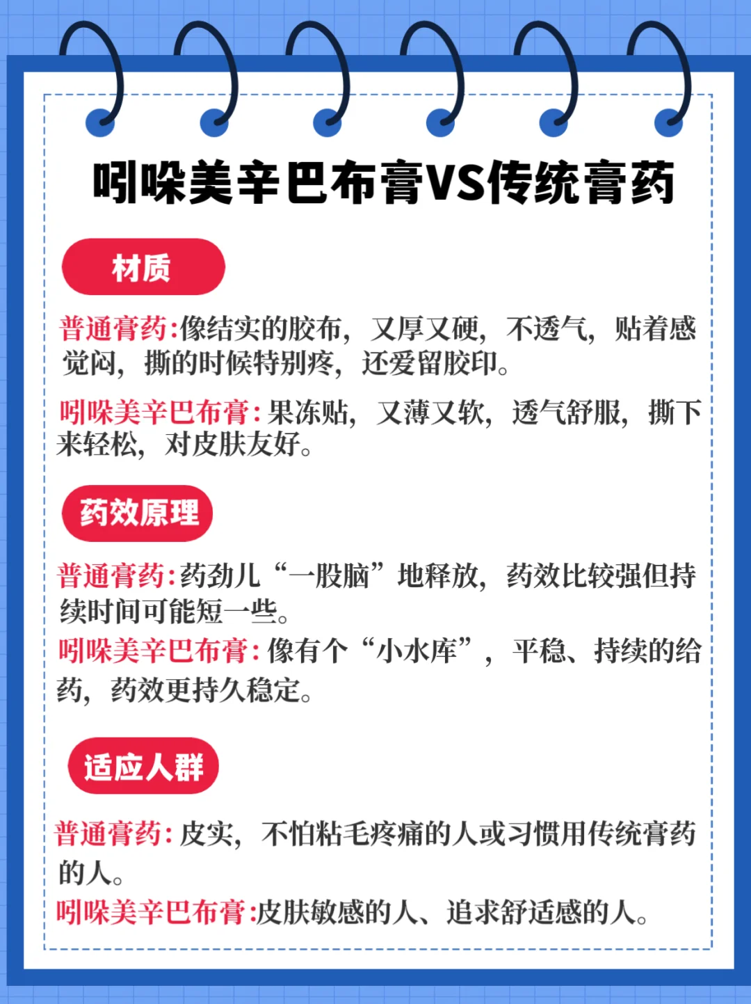 普通膏药:像结实的胶布,又厚又硬,不透气,贴着感觉闷,撕的时候特别疼,还爱留胶印。