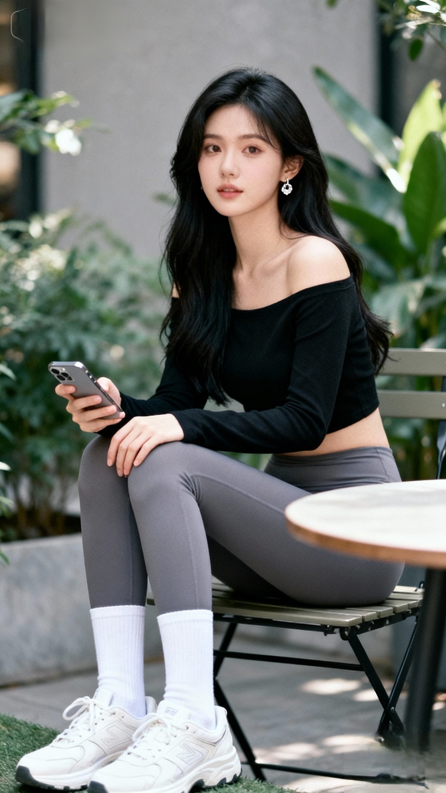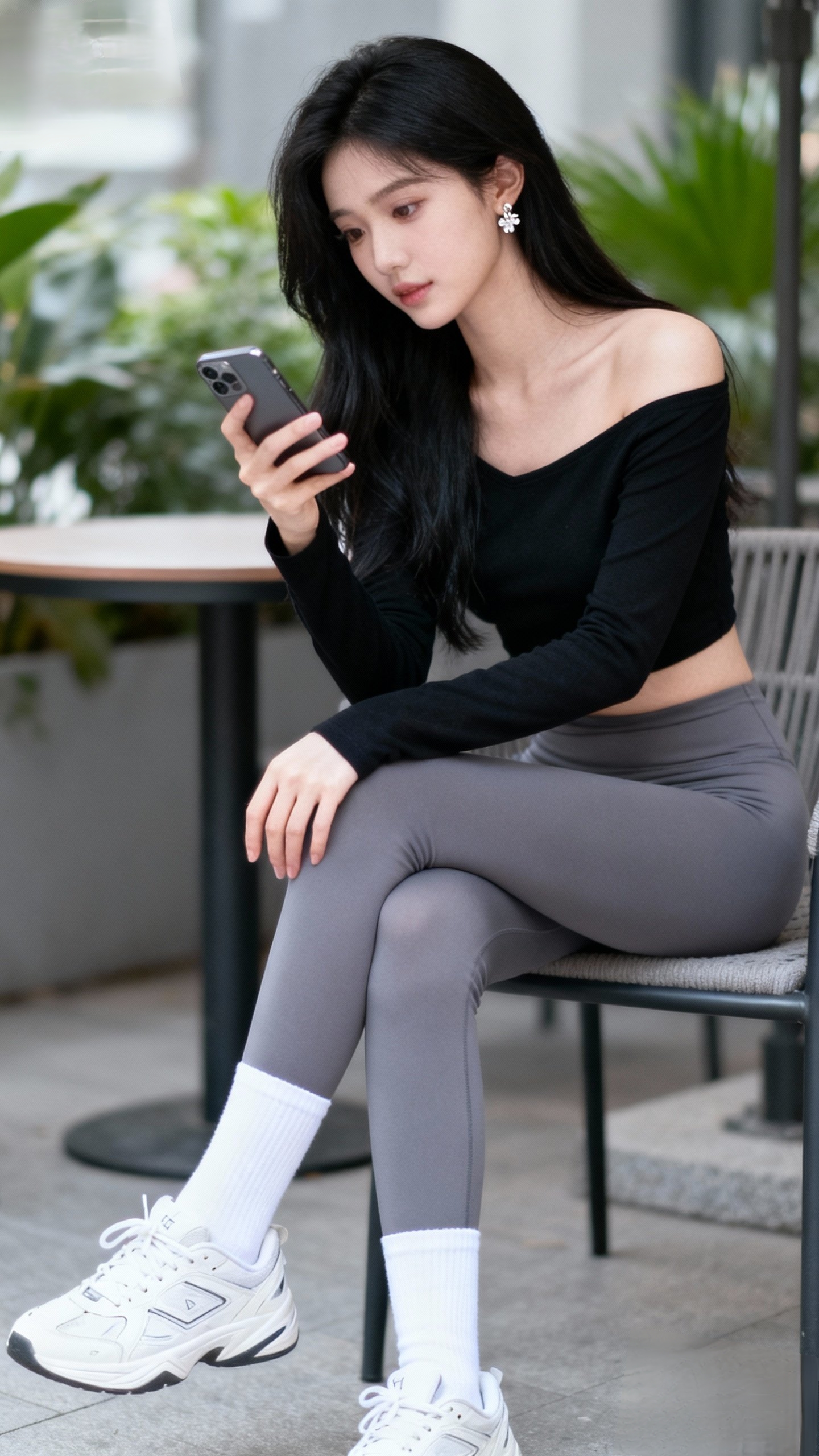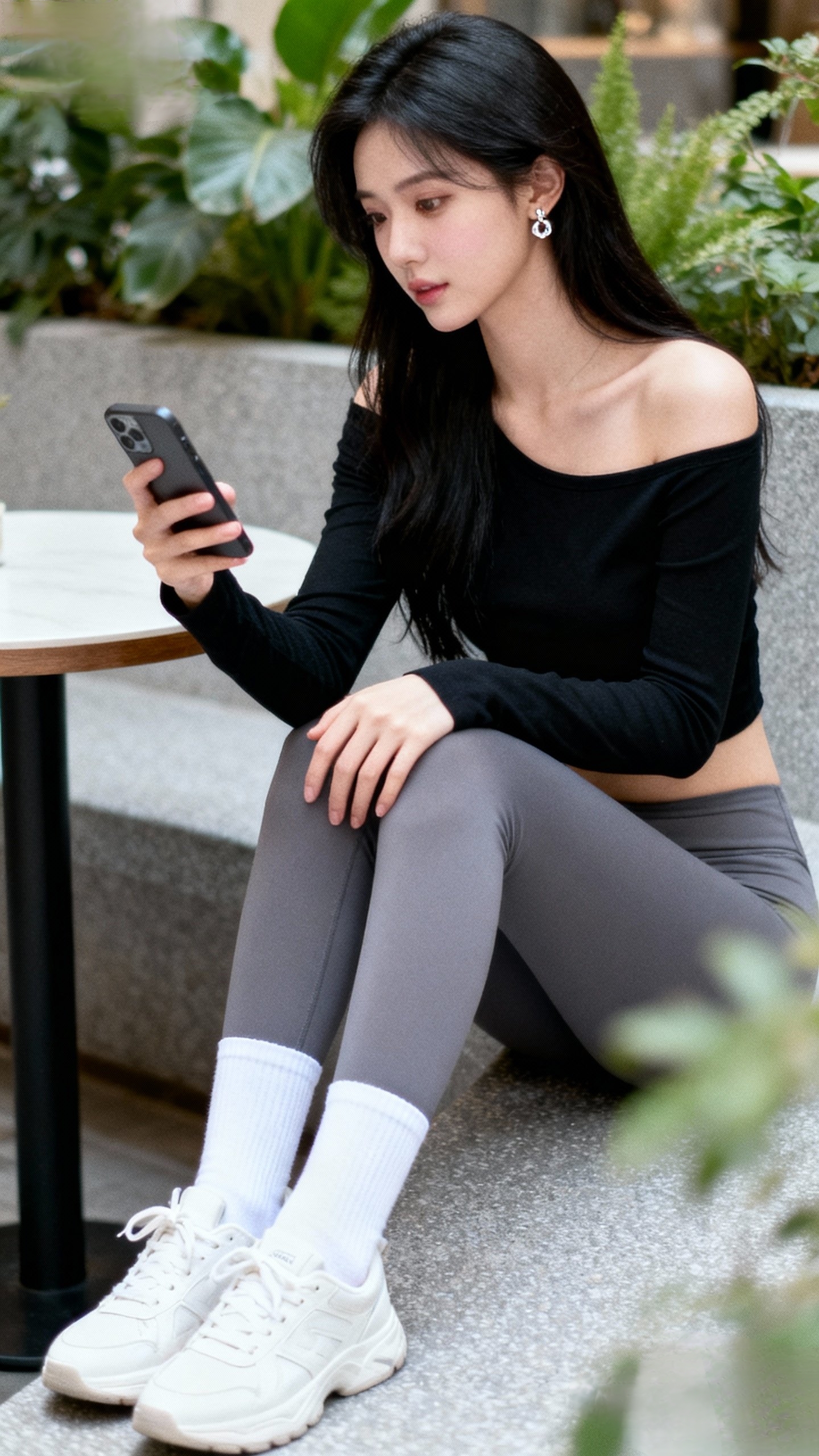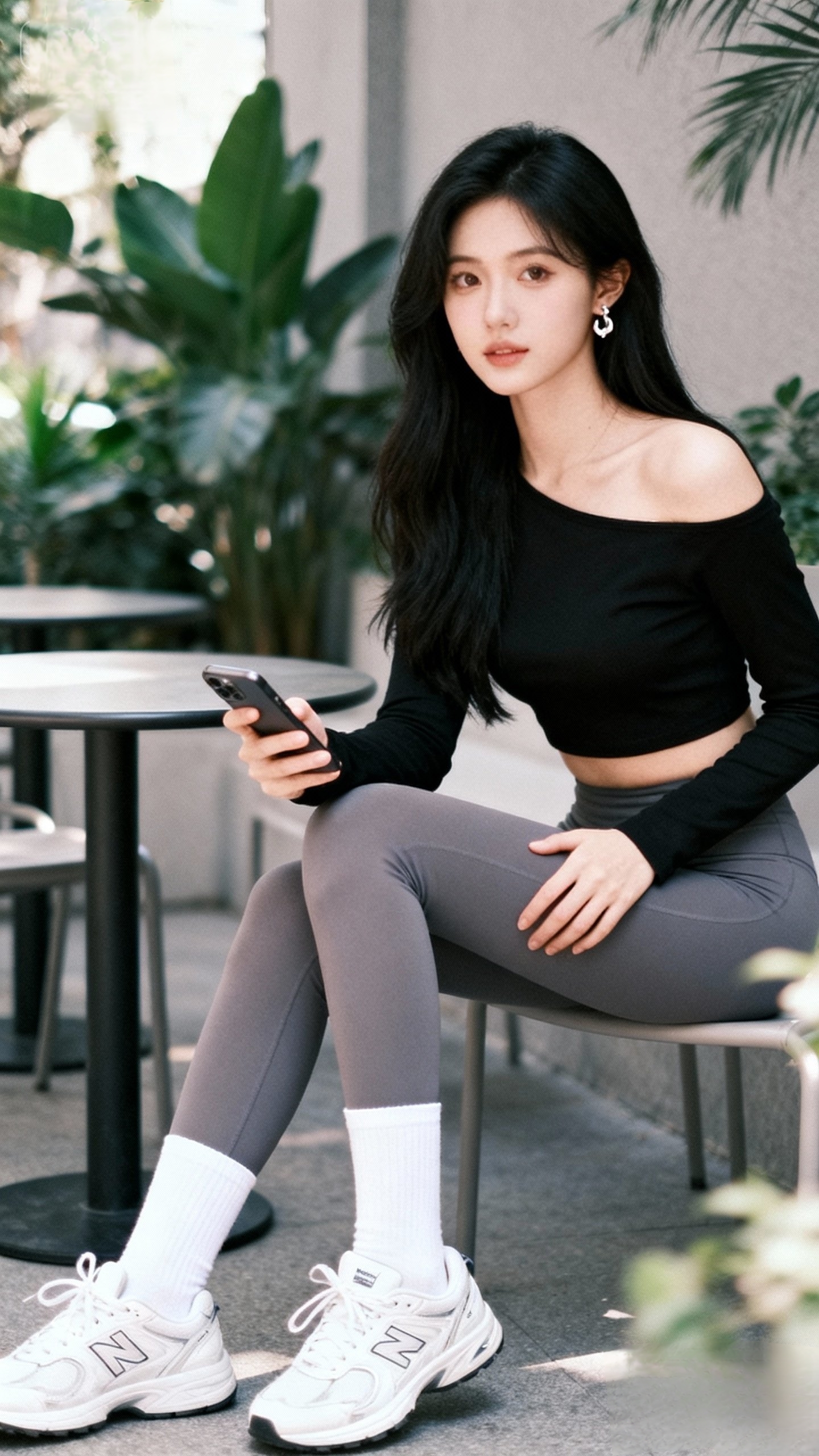 都市少女穿搭指南:黑上衣+灰紧身裤+白运动鞋,时尚又舒适!