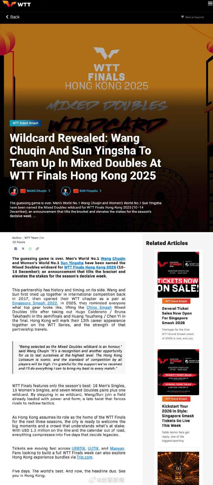 【#王楚钦回应获总决赛混双外卡#:会发挥最好水平】#王楚钦说很感激我们得到的支持# 11月26日,WTT香港总决赛混双外卡公布:王楚钦/孙颖莎。“被选为混双外卡是一种荣誉”王楚钦说,“这是一种认可,也是我们在最高水平上测试自己的另一个机会。香港体育馆是标志性的,所有选手的竞争水平都很高。我很感激我们得到的支持,我会尽我所能在每场比赛中发挥最好的水平。” #WTT# #王楚钦孙颖莎获总决赛混双外卡# (封面新闻)