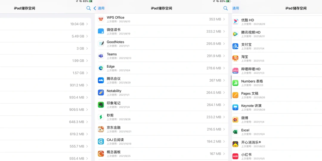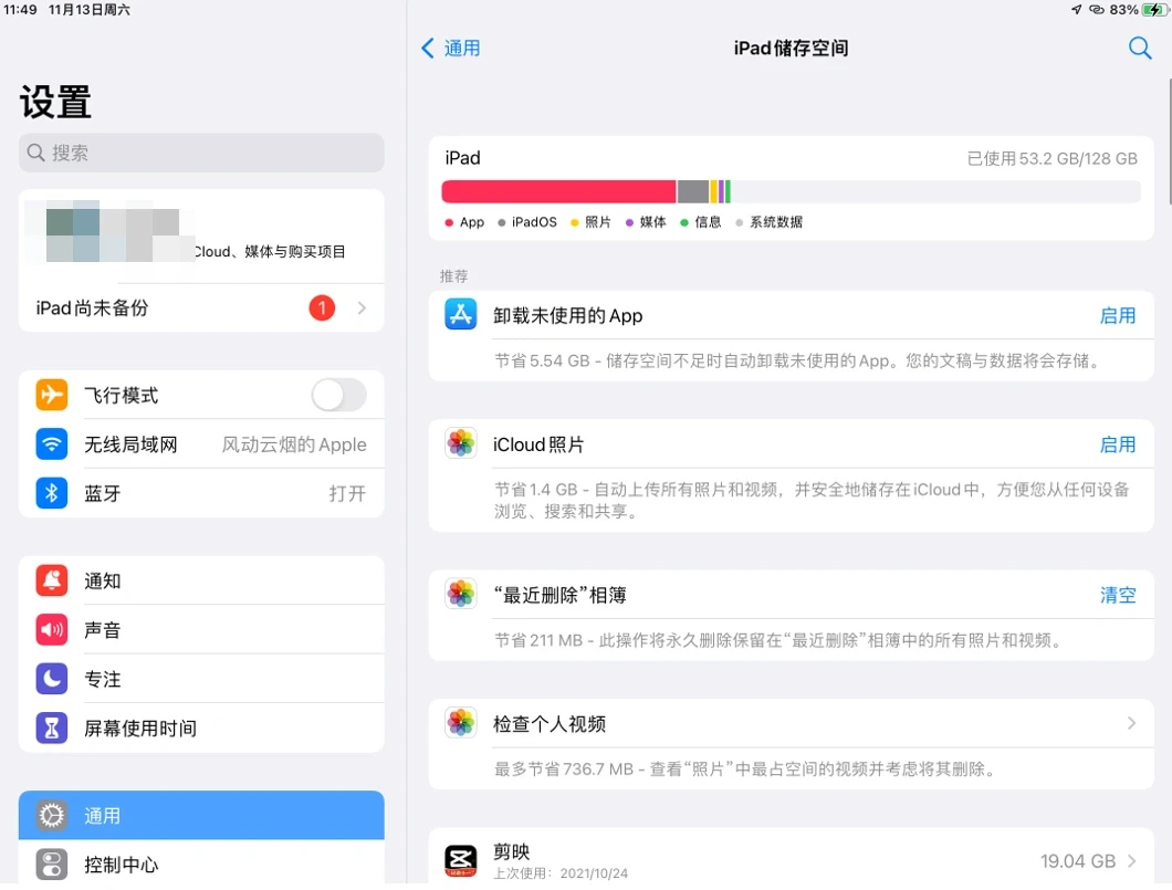 先说一句128G足够用了,但如果是加上剪视频,我觉得最好还是256G起步吧!😜 我目前手上总共有两台平板,都是128G的版本,可能是因为平常使用频率低的缘故,所以剩余的空间很足,iPad到现在也不过