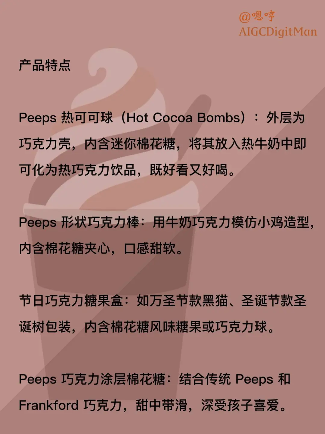 为了扩展品类,Just Born 授权 Frankford Candy 开发并销售基于 Peeps 形象的巧克力、软糖、热可可球等创新产品,让 Peeps 从传统棉花糖形象延伸到更多甜品形态,在节日市场中持续焕发活力。