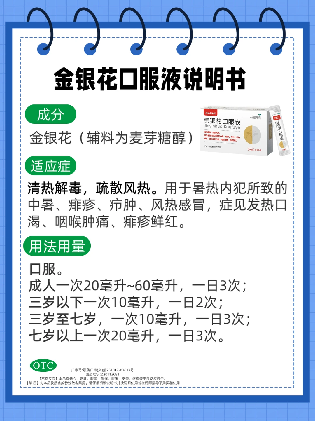 清热解毒、疏散风热。 适用情况: ✅中暑:在炎热的夏天,长时间在高温环境下容易中暑,出现头晕、口渴、乏力等症状。 ✅喉咙痛、牙龈疼痛。 ✅痈肿疮疡:皮肤出现红肿、疼痛的痈肿疮疡时。 ✅风热感冒:如果感冒是因为风热引起的,表现为发热、头痛、咽痛、咳嗽等症状。 📏用法用量: 口服。成人一次20毫升~60毫升,一日3次。儿童三岁以下一 次10毫升,一日2次;三岁至七岁,一次10毫升,一日3次;七岁以上一次20毫升,一日3次。 🈲对本品及所含成份过敏者禁用。