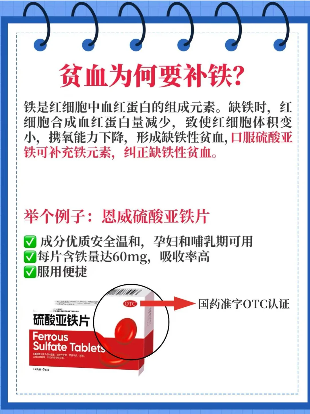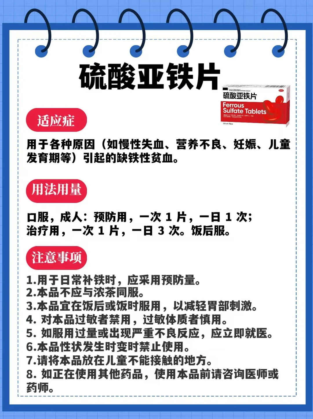 今日学习打卡➡️硫酸亚铁片 适应症:用于各种原因(如慢性失血、营养不良、妊娠、儿童发育期等)引起的缺铁性贫血。 用法用量:口服,成人:预防用,一次 1 片,一日 1 次;治疗用,一次 1 片,一日 3 次。饭后服。 恩威硫酸亚铁片的优势: 1、成分优质安全温和,孕妇和哺乳期可用 2、每片含铁量达60mg,吸收率高 3、服用便捷 4、国药准字OTC认证