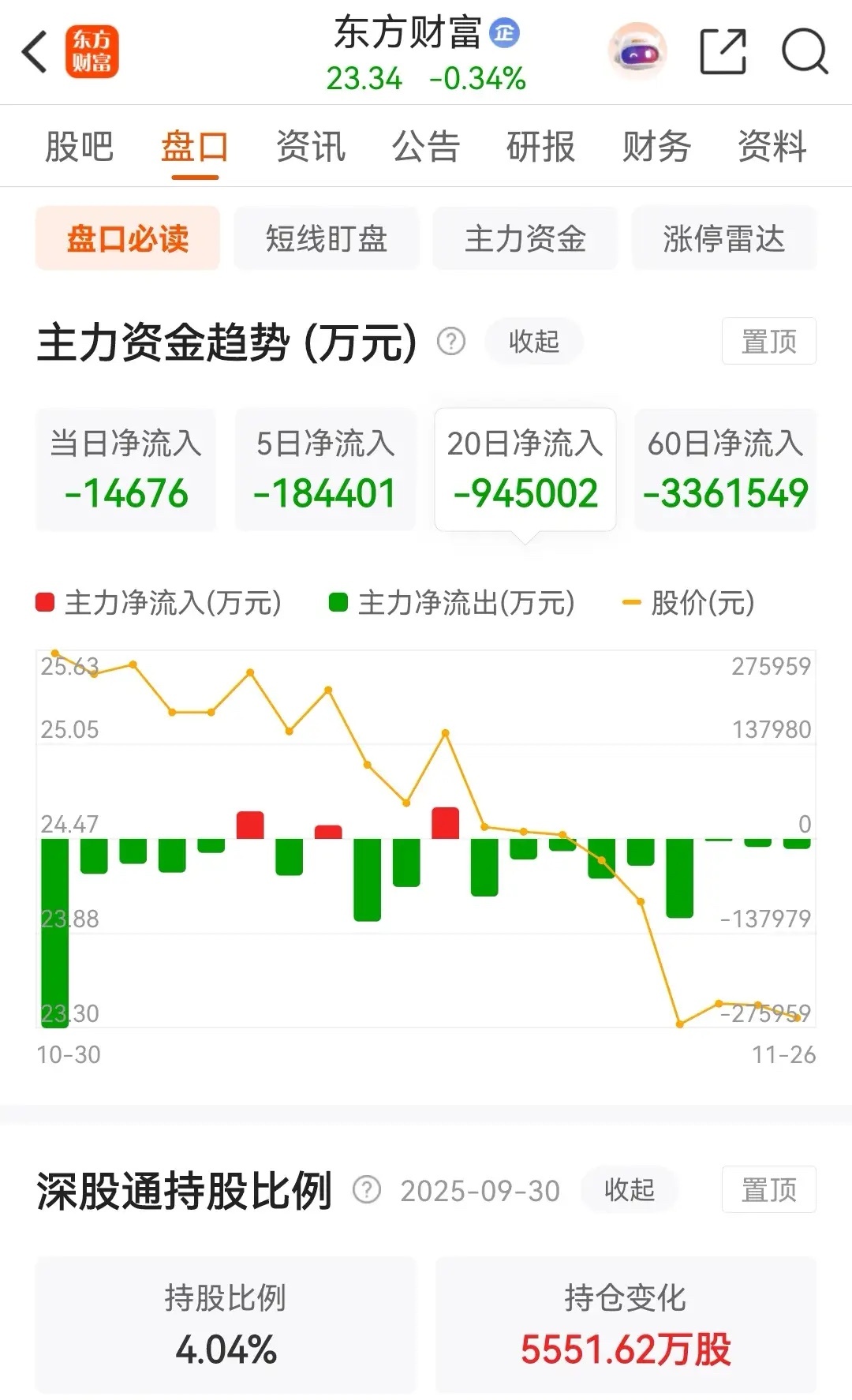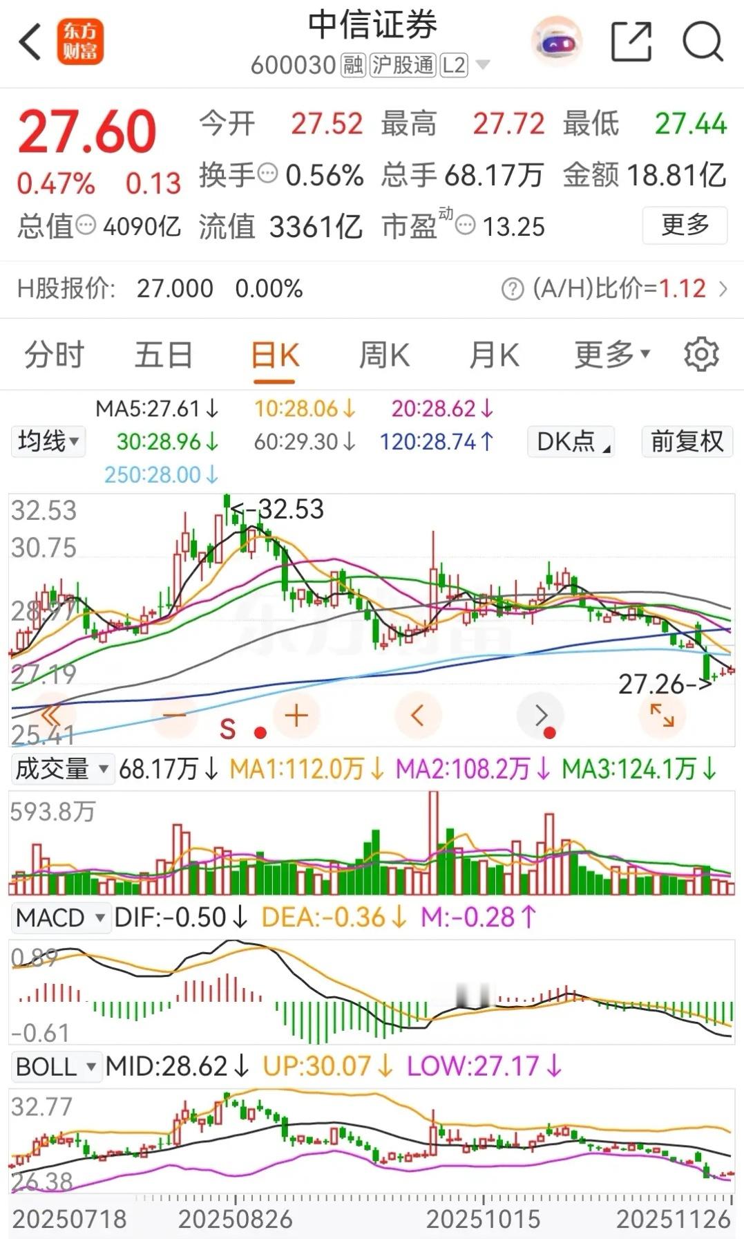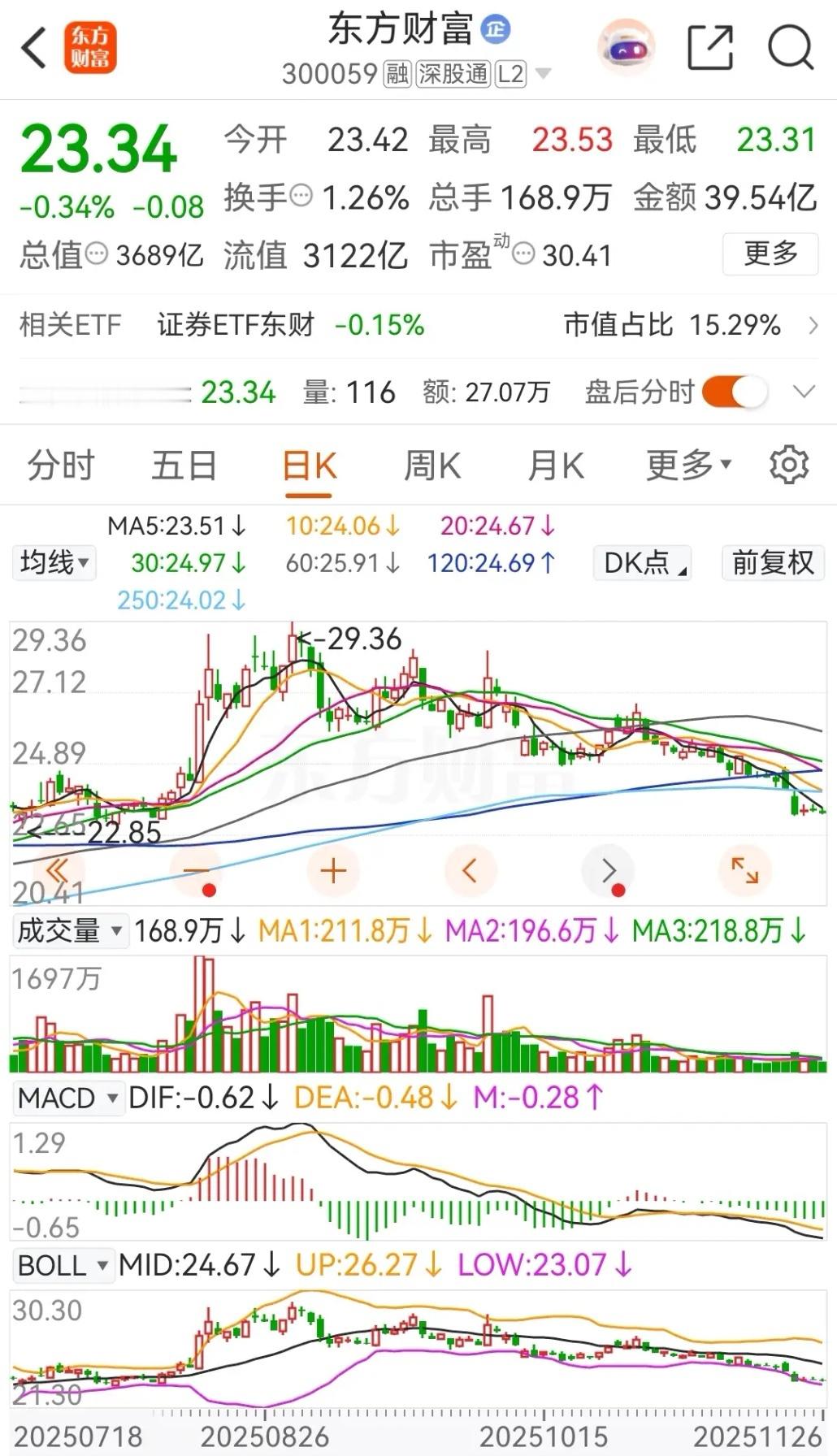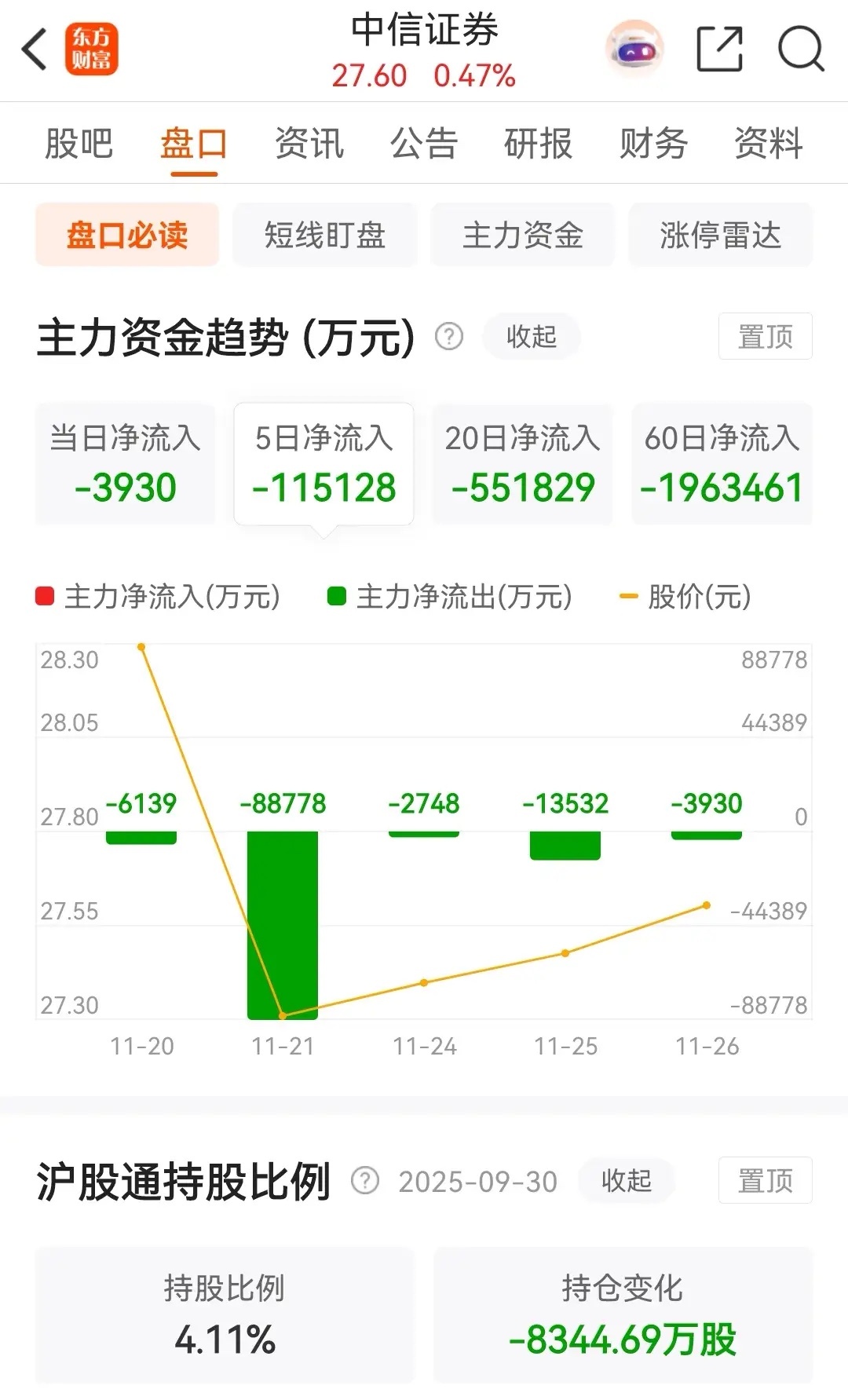 东方财富连续三天在低位缩量整理,且被主力资金连续九天净卖出;而中信证券,则是连续三天在底部收出缩量小阳星,连续三天小反弹。东方财富今天平开后冲高回落,午后持续走低,最终收出了一根缩量十字星线,股价下跌了约0.34%,报价23.34元,全天的成交金额为 39.54 亿元,已是缩量到了极致。在资金流向上,目前是连续九天被主力资金净卖出,今天的净卖额约为1.4676亿元,近五个交易日则是合计净卖出了约18.4401亿元,而近20个交易则是仅有3天净买入,其余17均是净卖出,合计净卖出金额为94.500亿元。中信证券目前是连续三天在低位收出缩量小阳星,今天的涨幅为 0.47%,收盘报价为27.60元,全天成交金额为18.81亿元。在资金流向上,目前已是连续五天被主力资金净卖出,今天被主力资金净卖出了0.3930亿元,近五个交易日则是合计净卖出了 11.5128亿元,近20个交易日则是合计净卖出了55.1829亿元。从技术面上看,东方财富是连续三天在低位横盘缩量整理,连续三天收出缩量十字星线,而中信证券则是连续三天在低位收出缩量小阳星,走出了三连涨的态势,也是挺有趣的。至于更详细的技术分析,可以查看上一篇中关于券商概念板块的走势分析。近一段时间,对于东方财富和中信证券来说,受到政策调控影响比较明显。目前监管层通过压制权重股(如中信尾盘出现31亿压单)调节指数节奏,防范市场过热。券商的角色从“牛市旗手”转为指数调控工具,导致业绩与股价显著背离。另外,东财高估值( PE 37倍 )依赖持续高成交额(需要维持1.5万亿元以上),若市场缩量则承压会更大。