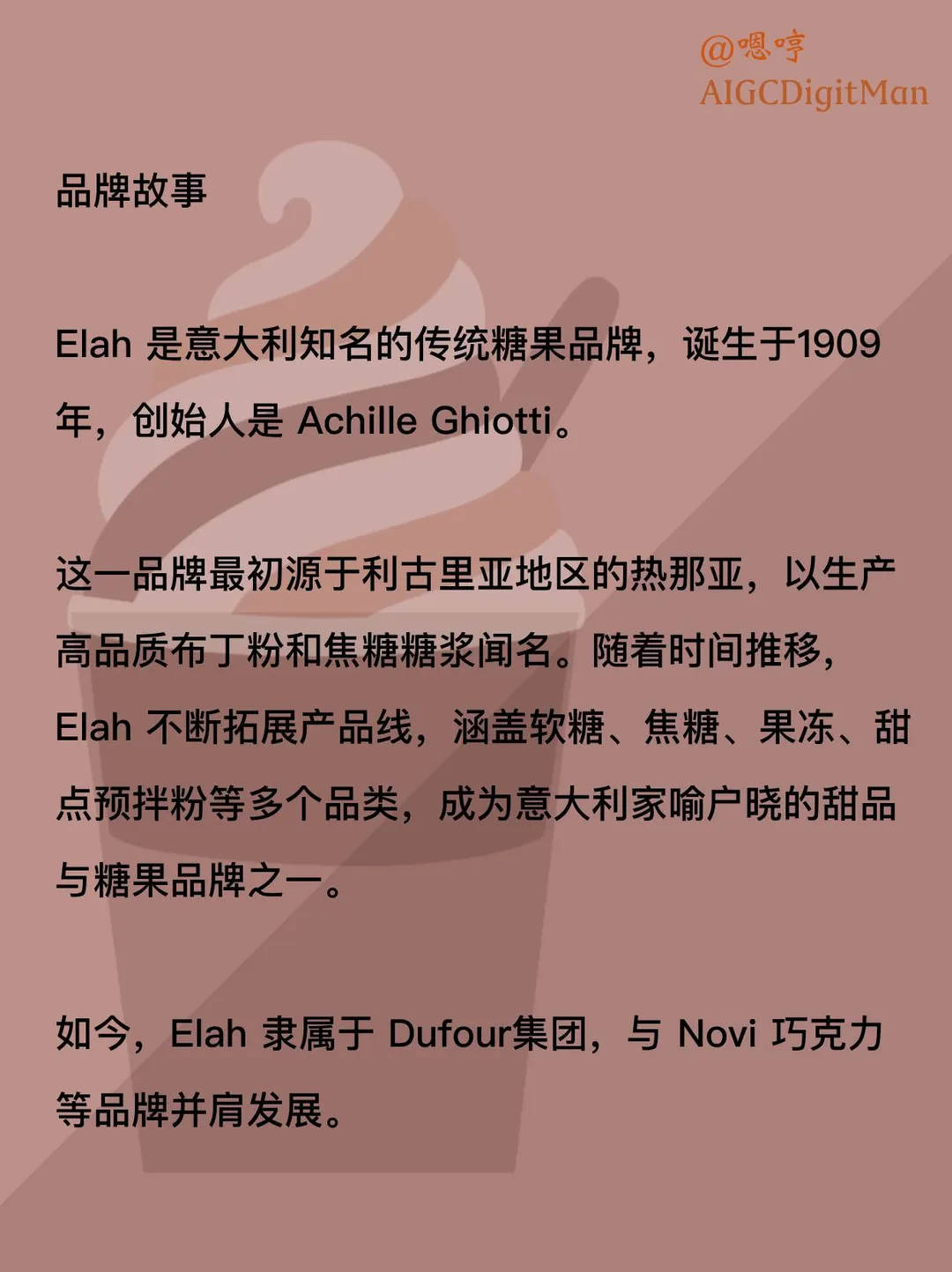 随着时间推移,Elah 不断拓展产品线,涵盖软糖、焦糖、果冻、甜点预拌粉等多个品类,成为意大利家喻户晓的甜品与糖果品牌之一。
