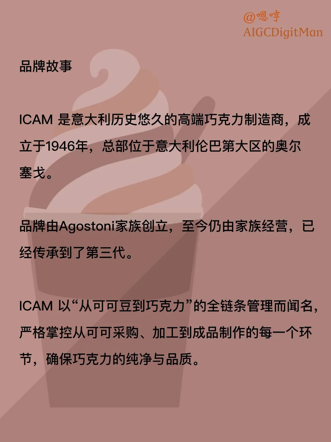 ICAM 是意大利历史悠久的高端巧克力制造商,成立于 1946 年,总部位于意大利伦巴第大区的奥尔塞戈。