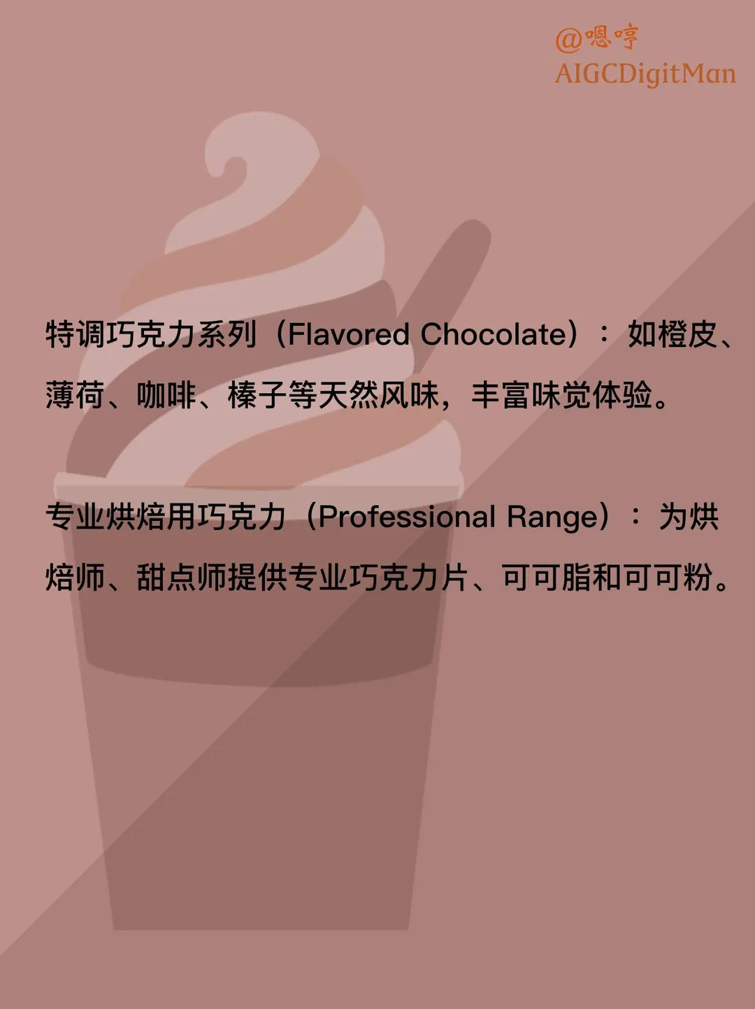专业烘焙用巧克力(Professional Range):为烘焙师、甜点师提供专业巧克力片、可可脂和可可粉。