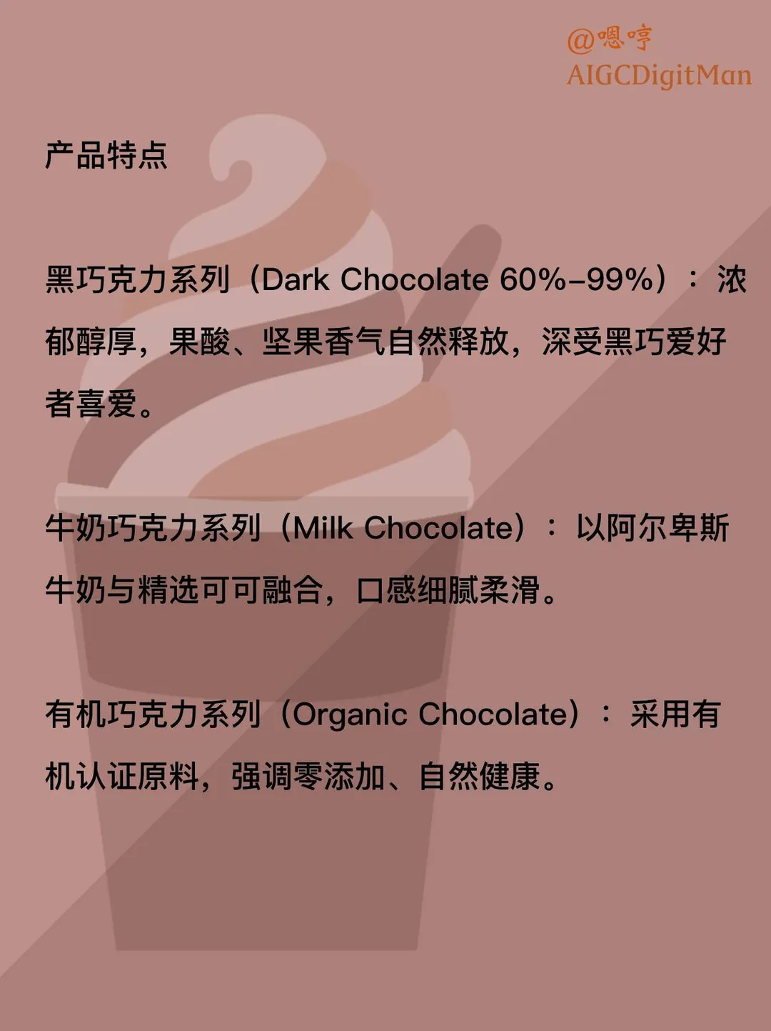 有机巧克力系列(Organic Chocolate):采用有机认证原料,强调零添加、自然健康。