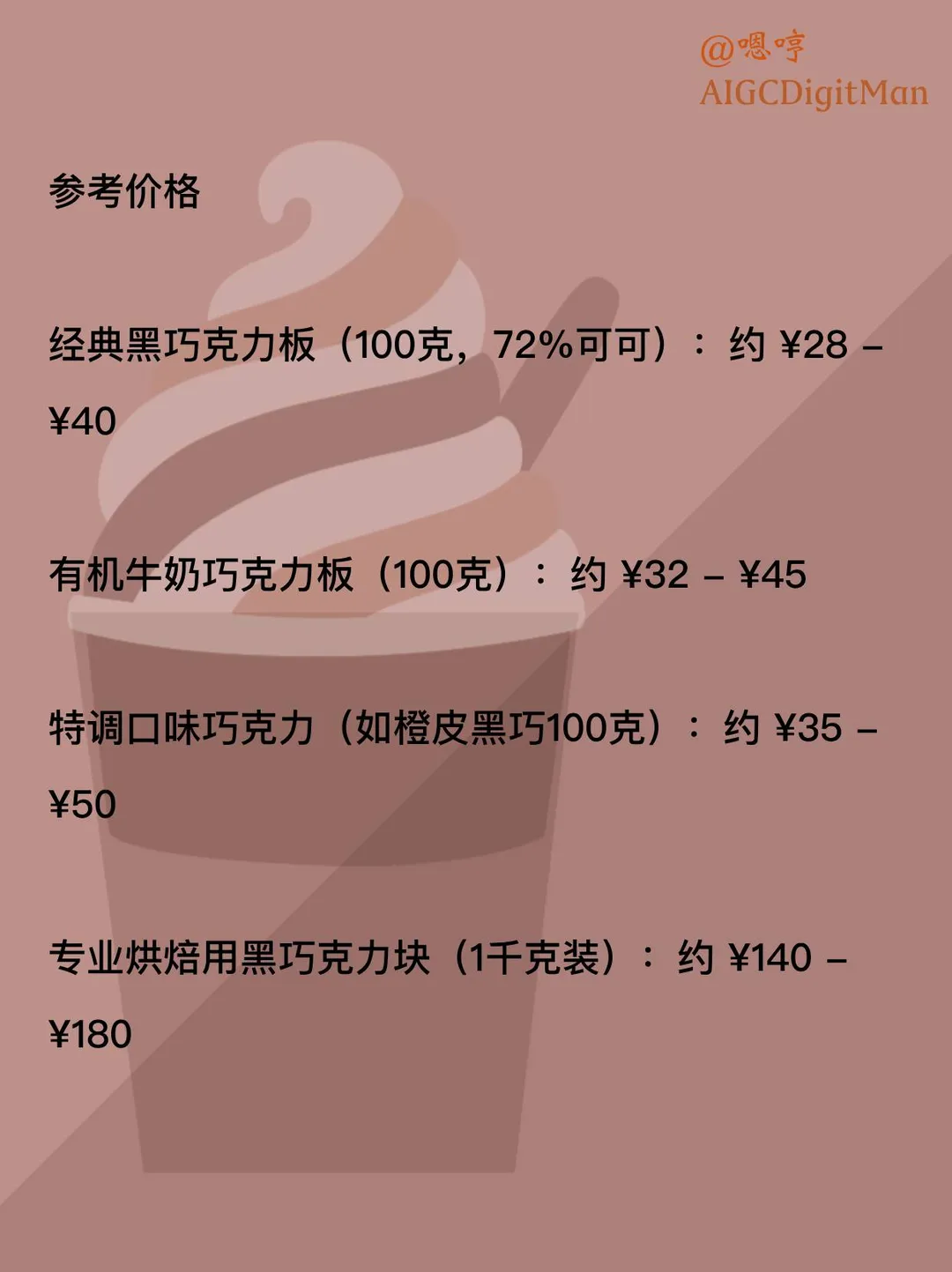 特调口味巧克力(如橙皮黑巧 100 克):约 ¥35 - ¥50