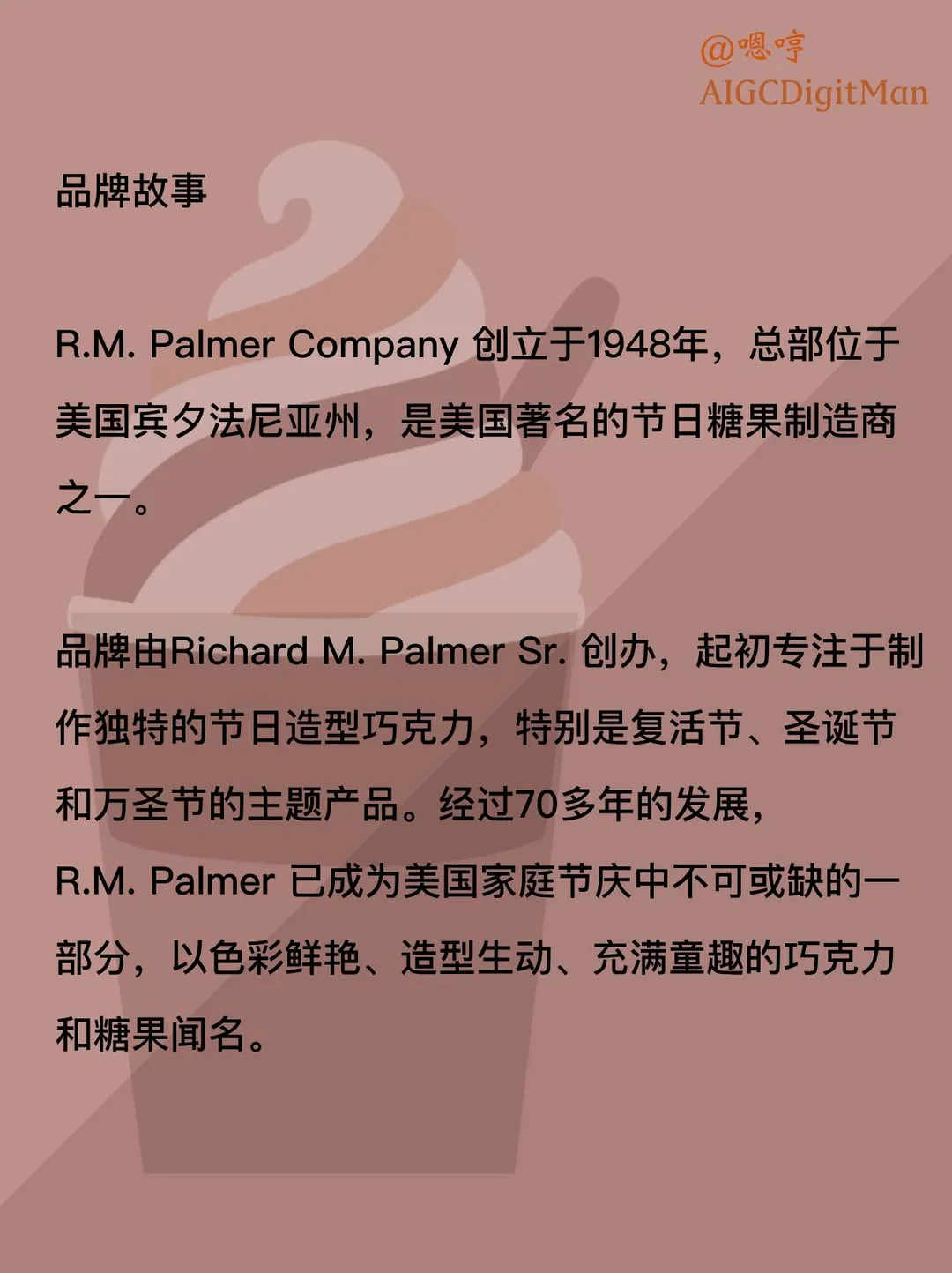 R.M. Palmer Company 创立于1948年,总部位于美国宾夕法尼亚州,是美国著名的节日糖果制造商之一。