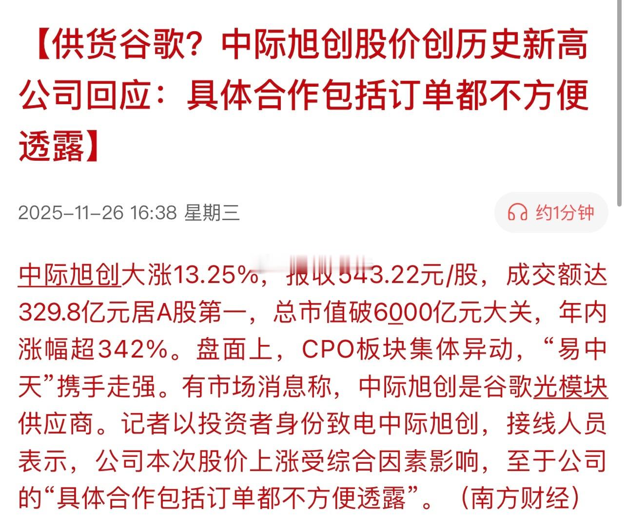 供货谷歌?中际旭创股价创历史新高公司回应:具体合作包括订单都不方便透露…最后的疯